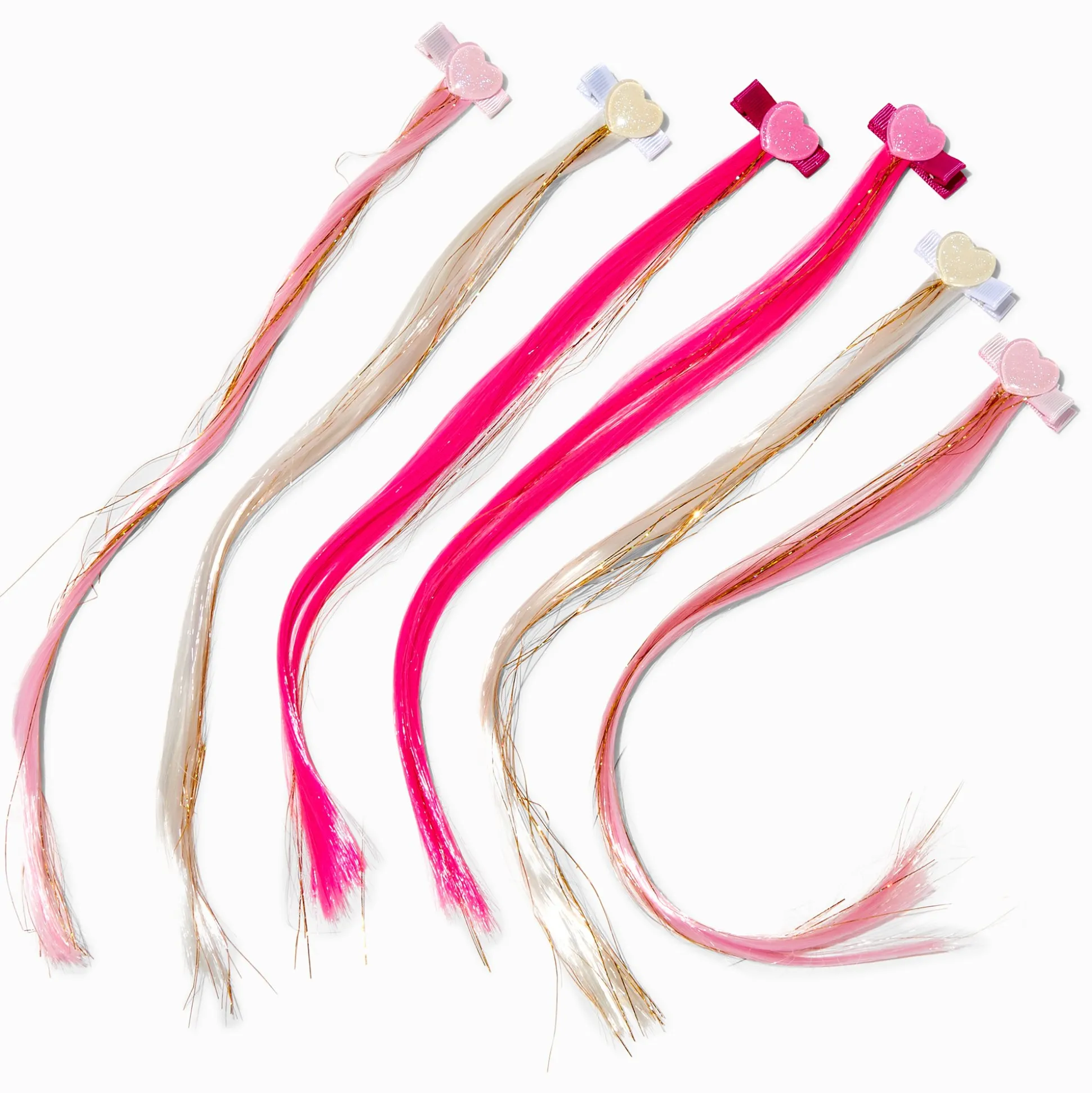 Clip in some fun in her hair with this set of faux hair clips. Each clip features a star charm with a different colored faux hair strand with a heart-shaped clip at the top.