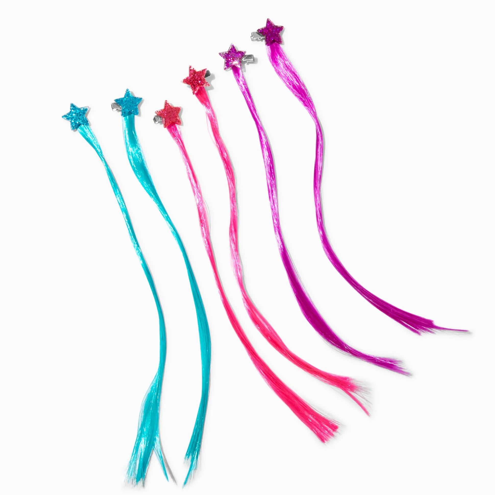 Add bright streaks of bright color to her hair with these clips! Each clip also has glittery star design on the clip at the top. Wear one, wear a few, or wear them all together!
