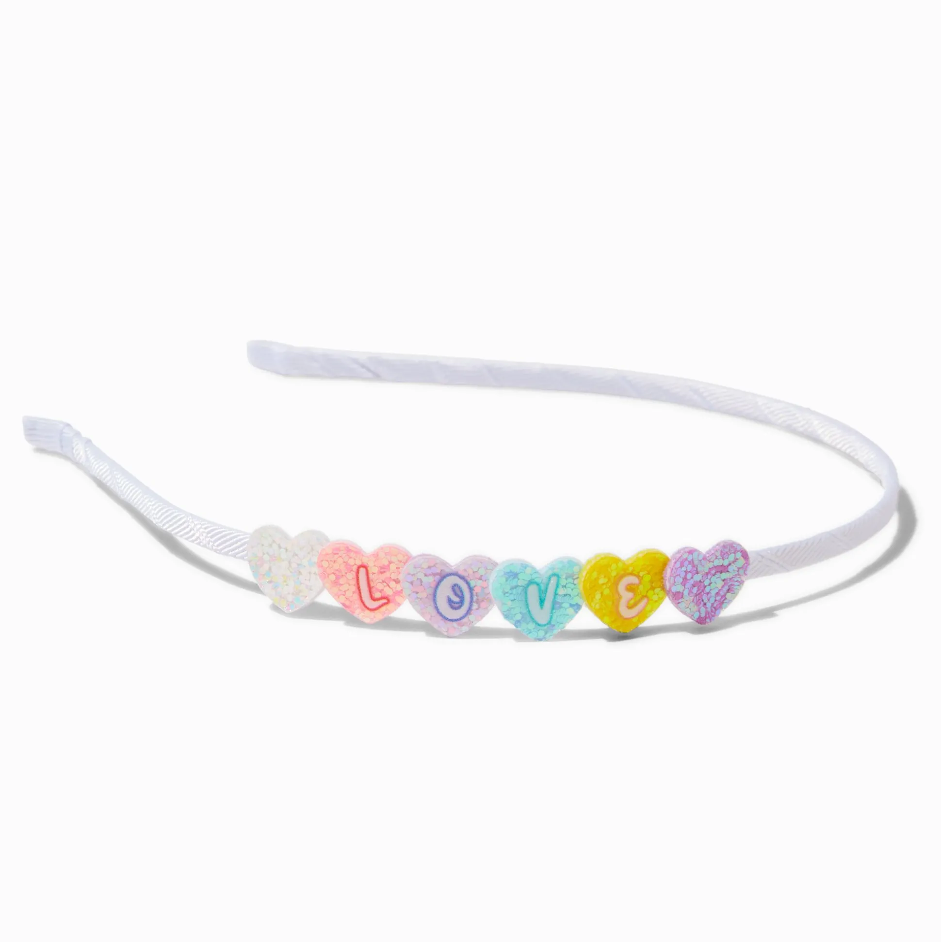 Pull back her hair & bangs with this heart headband. This headband has a row of glittery “Love” hearts.