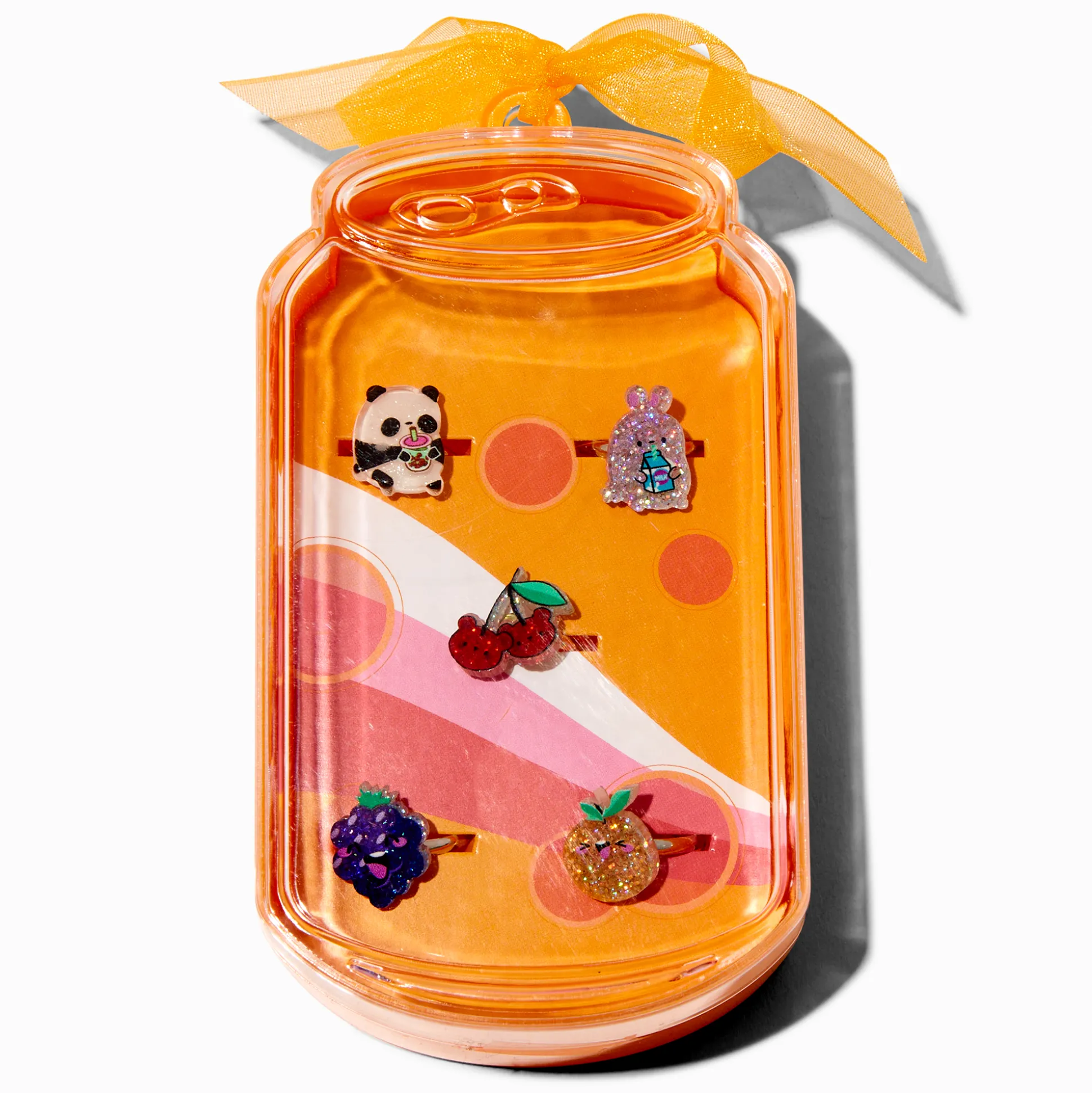 With five designs to choose from, she can wear a different ring every day of the school week! Adjustable fit silver-tone set includes panda and rabbit drinking and orange, cherry, and grape designs, all stored in a soda can-shaped box.