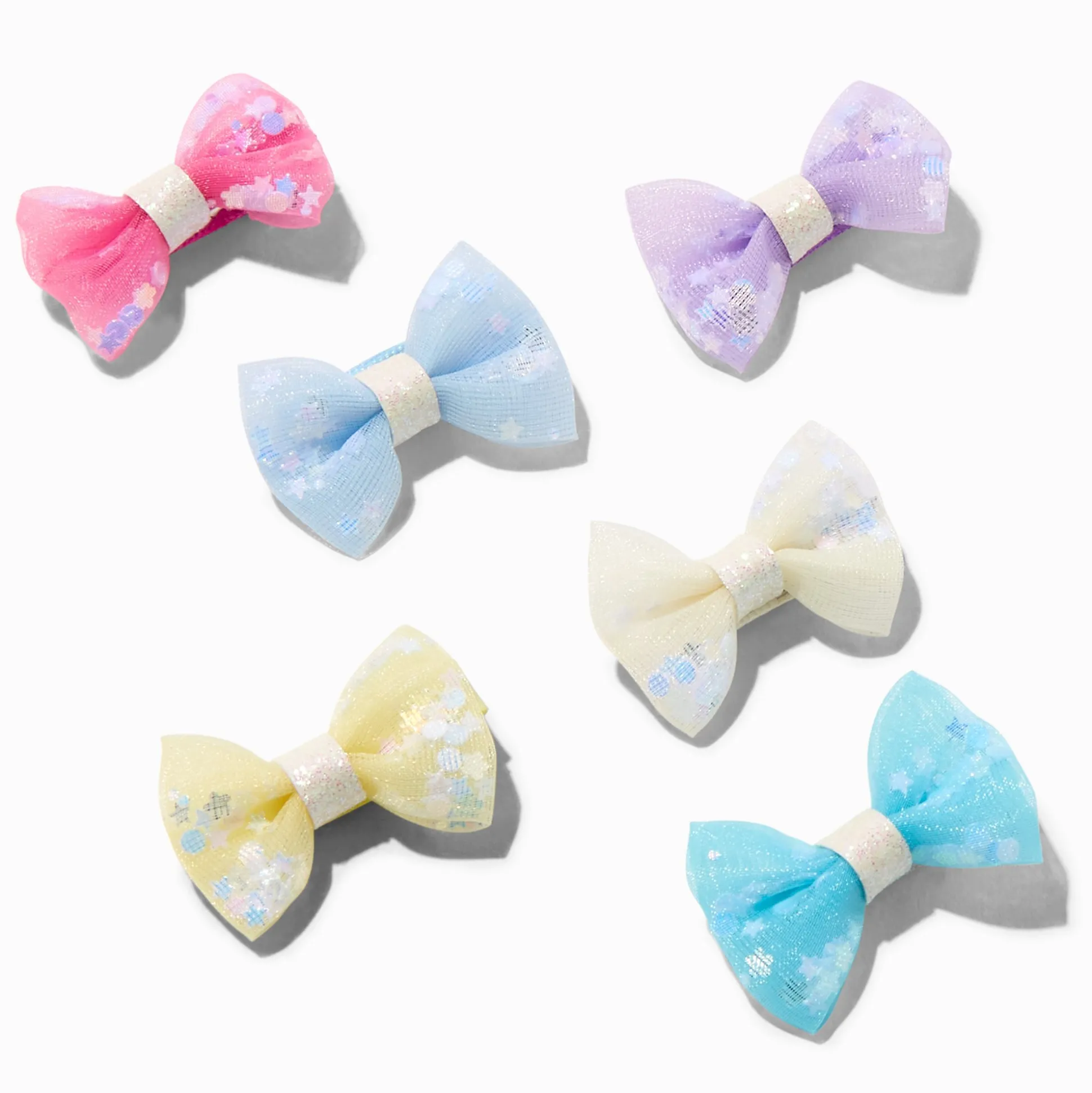 Dress up her hairstyle on carefree summer days with this cute set of hair bows. This set of six hair bow clips with chiffon material have an array of pastel colours and star-shaped sequin detailing.