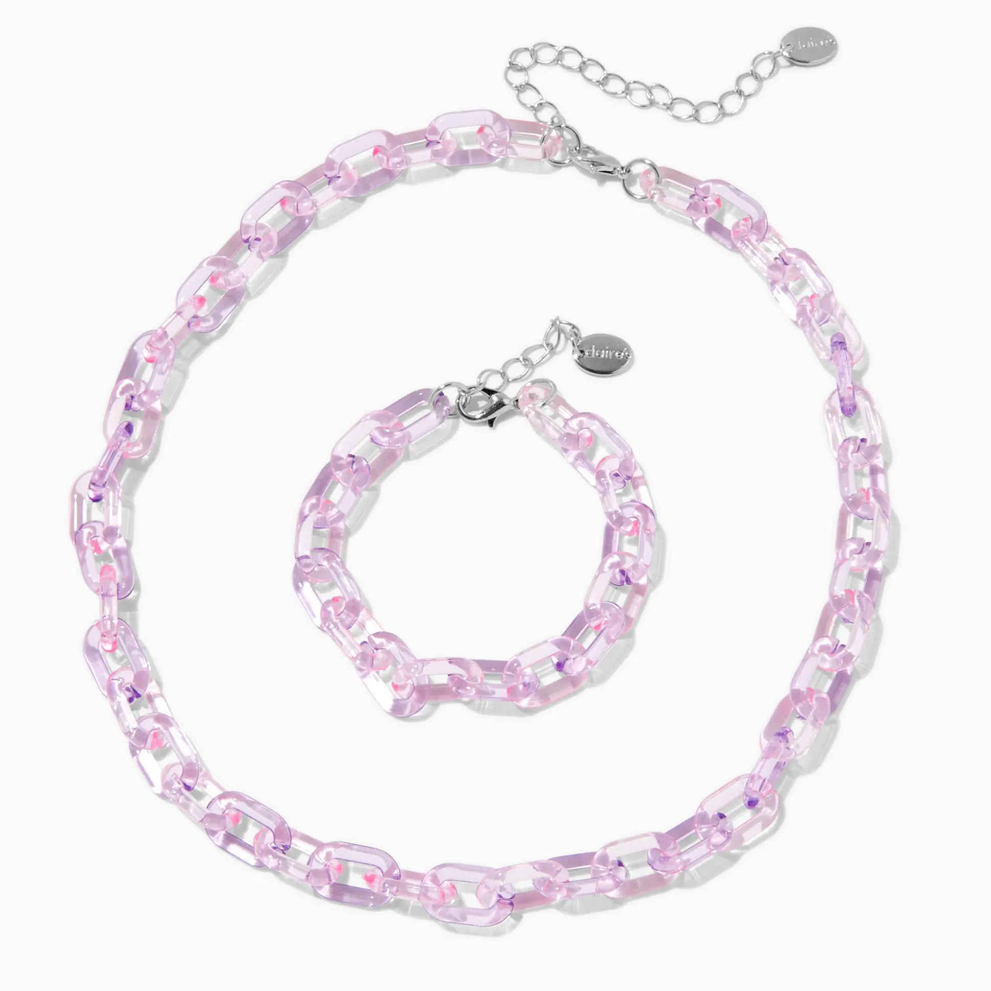 Give her a funky look in this eclectic jewelry set. It includes an acrylic necklace and bracelet. The set is decorated with a chunky chainlink design and purple hue.