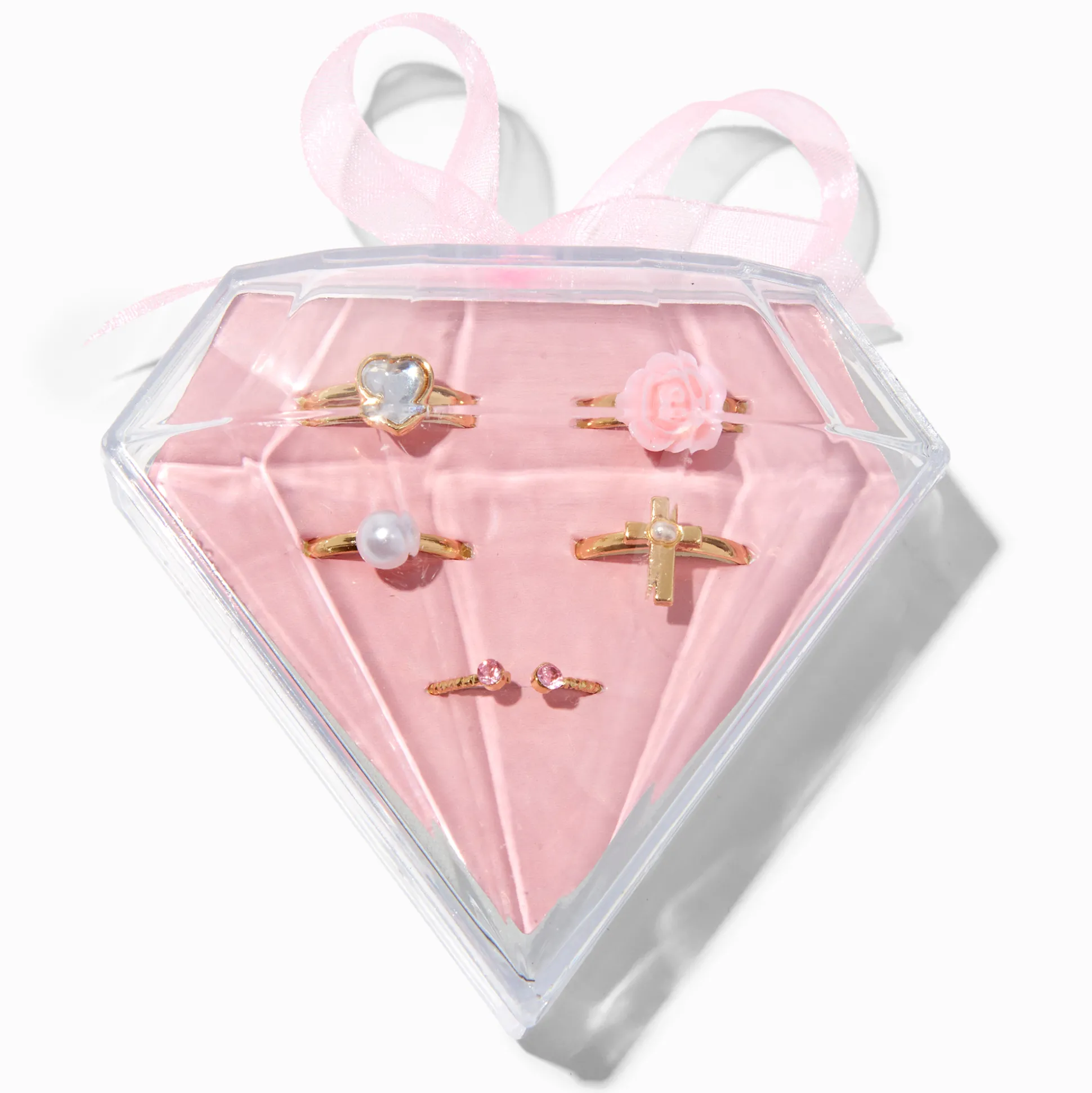 With five designs to choose from, she can wear a different ring every day of the school-week! Adjustable fit gold-tone set includes special occasion designs, all stored in a diamond-shaped box.