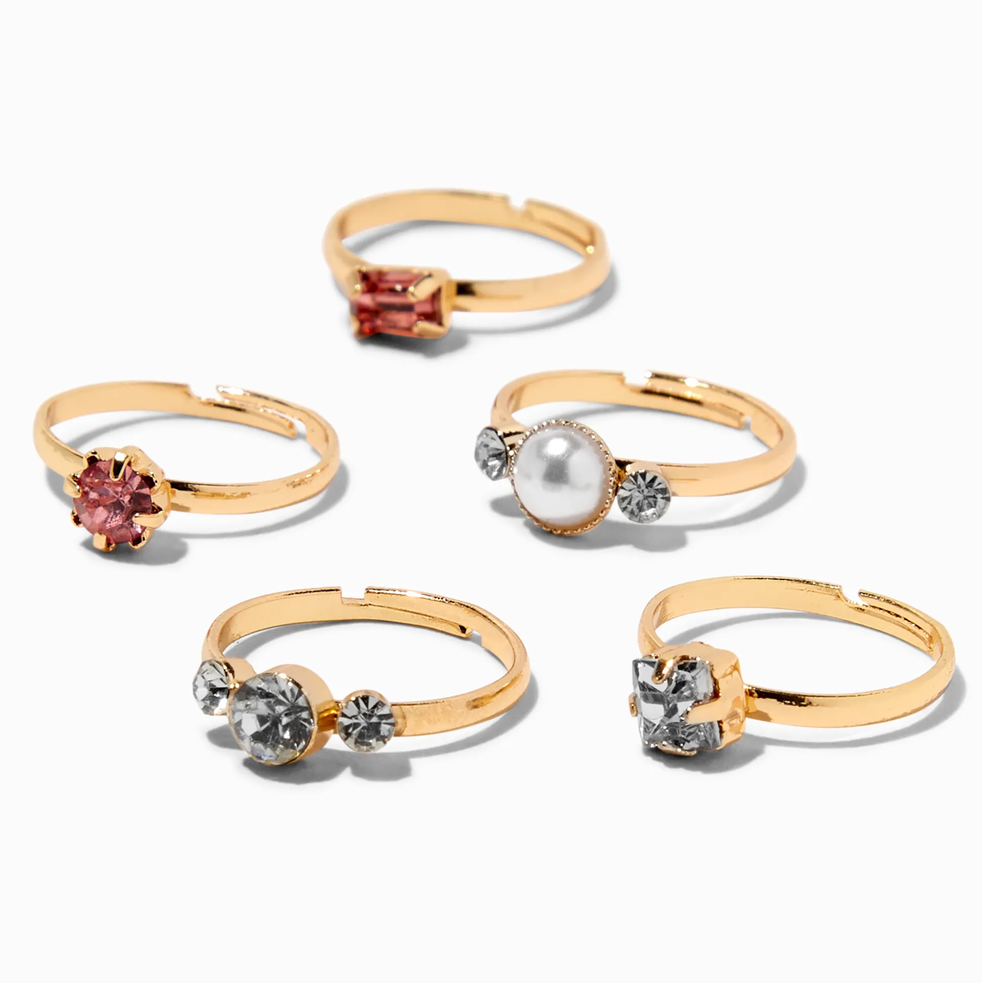 Accessorize her special occasion outfit with these girly rings! This pack of 5 adjustable rings are here to make her day. With a different faux gem on each ring, the mix-and-match ideas are endless. Stack or wear on their own to add sparkle to every outfit.