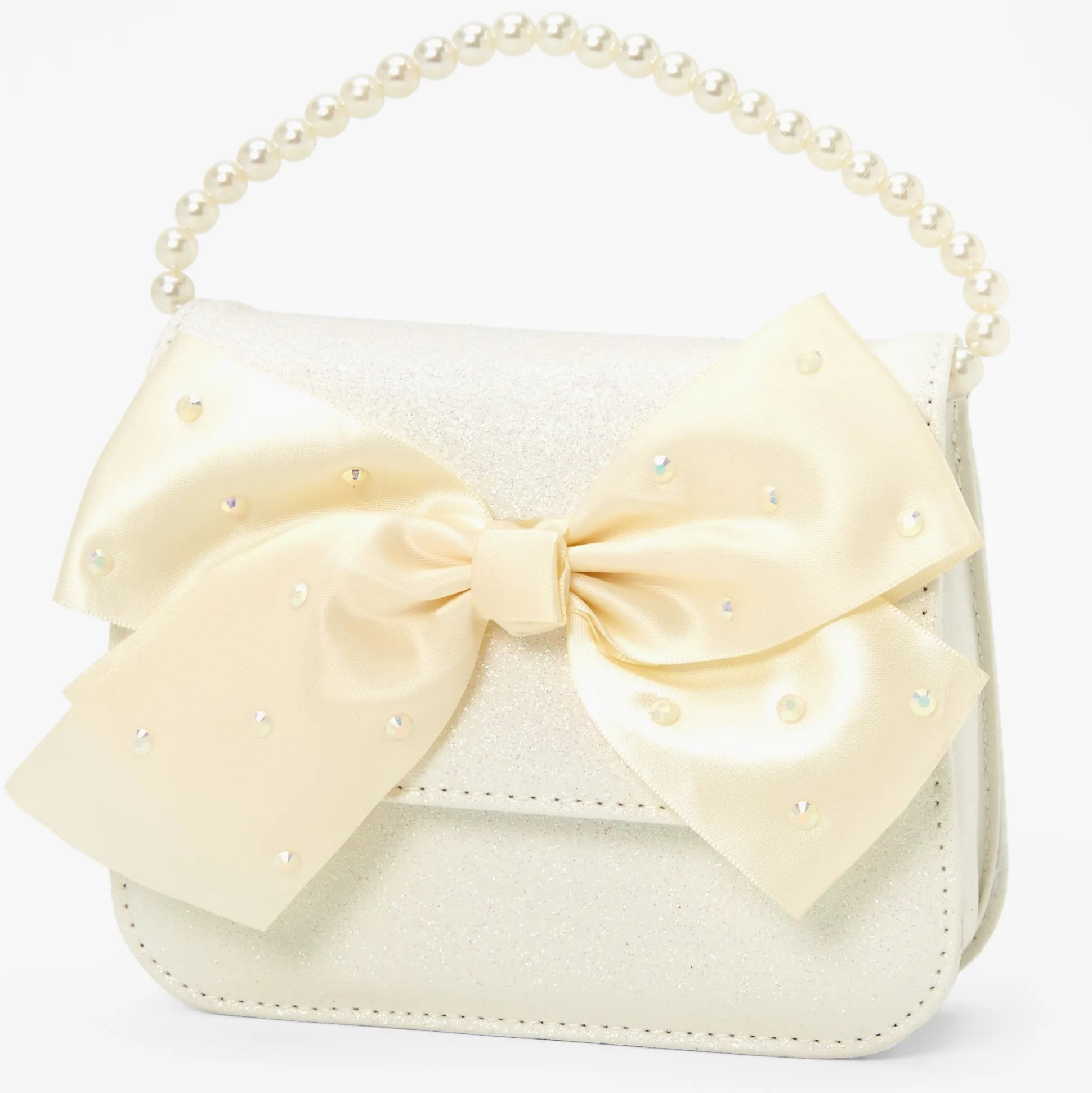 Glitter, pearls, and chiffon flowers scream special occasion! This purse is the perfect evening bag for that coveted ‘special day’, and finalizing accessory for her formal look.