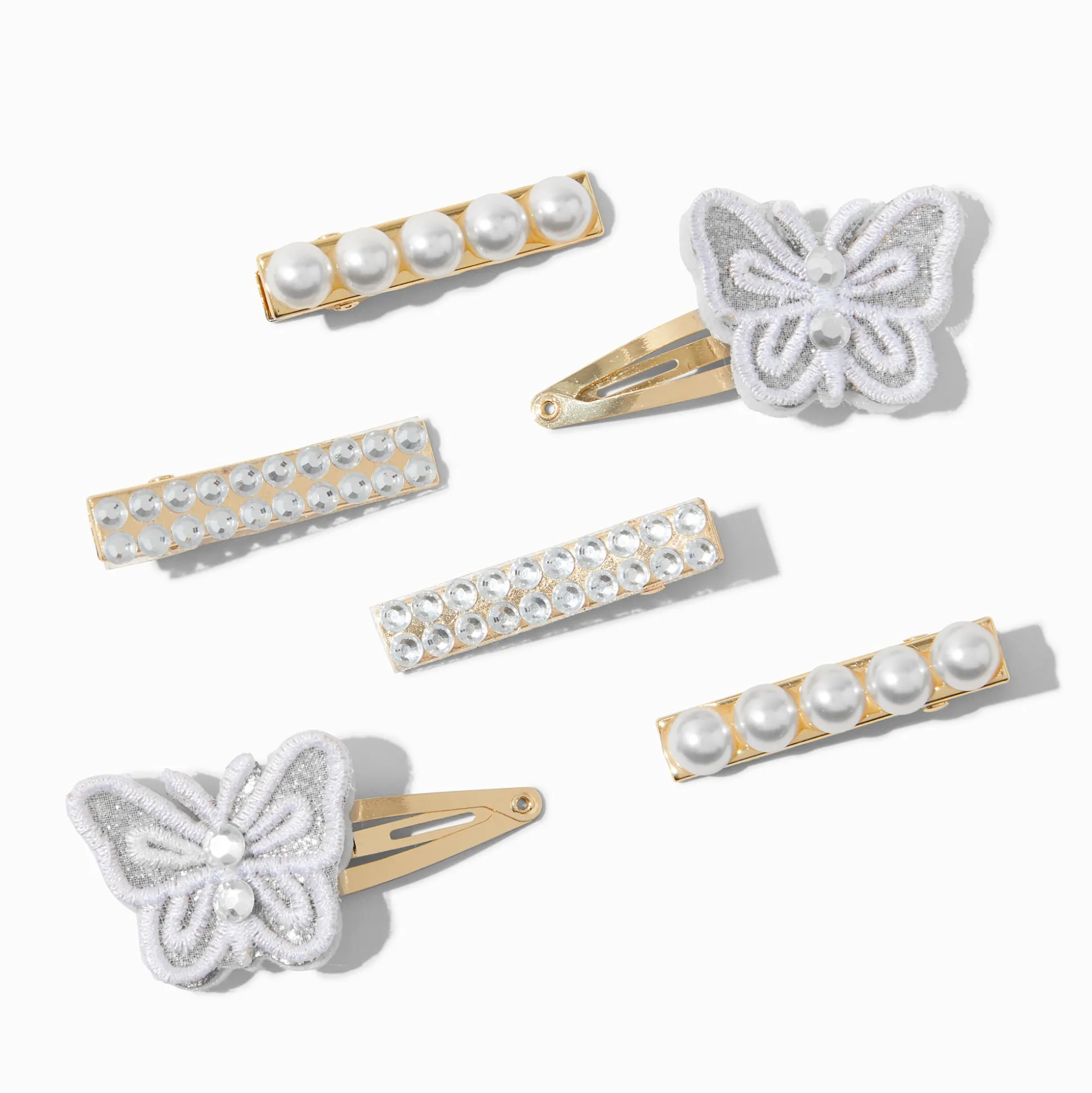 Clips add such a sweet touch to any hairstyle! This pack of six clips have glitter butterfly charms & neutral hues that will match any special occasion ‘fit.