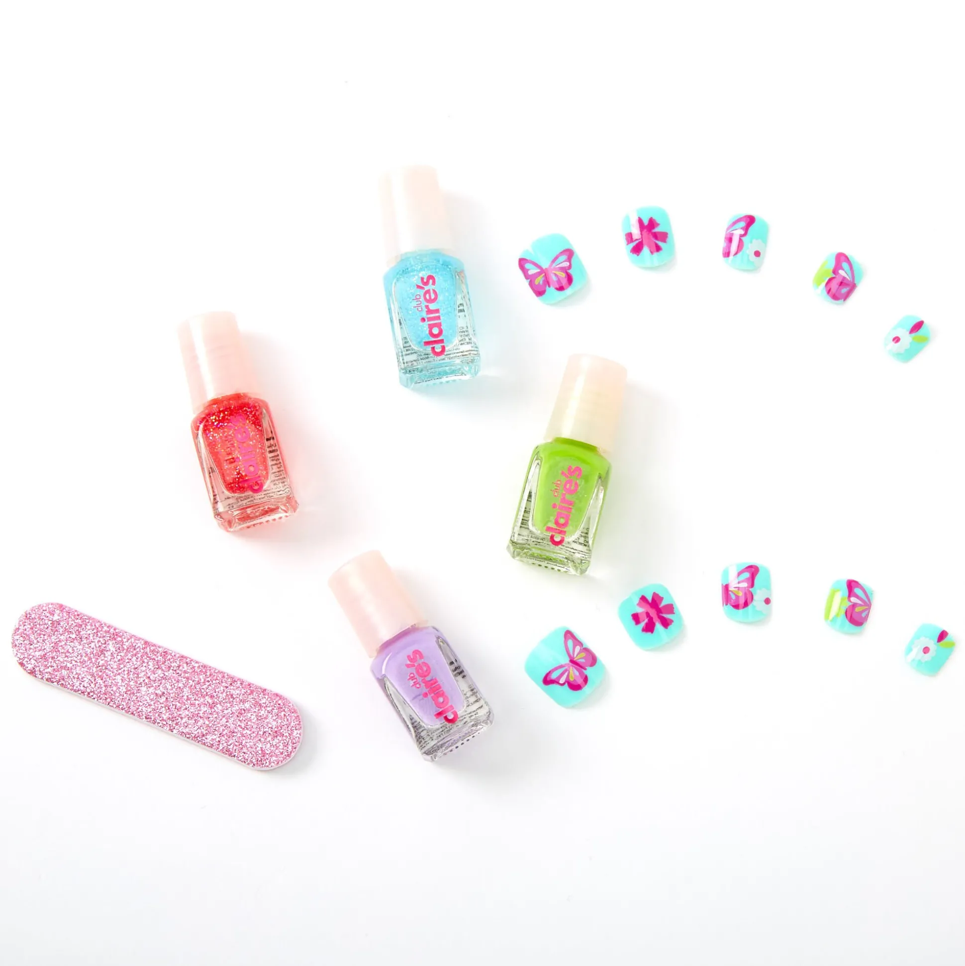 Create pretty springtime nails with this nail kit treasure chest! Included are 4 nail polishes, a set of faux nails, nail stickers, and a nail file.