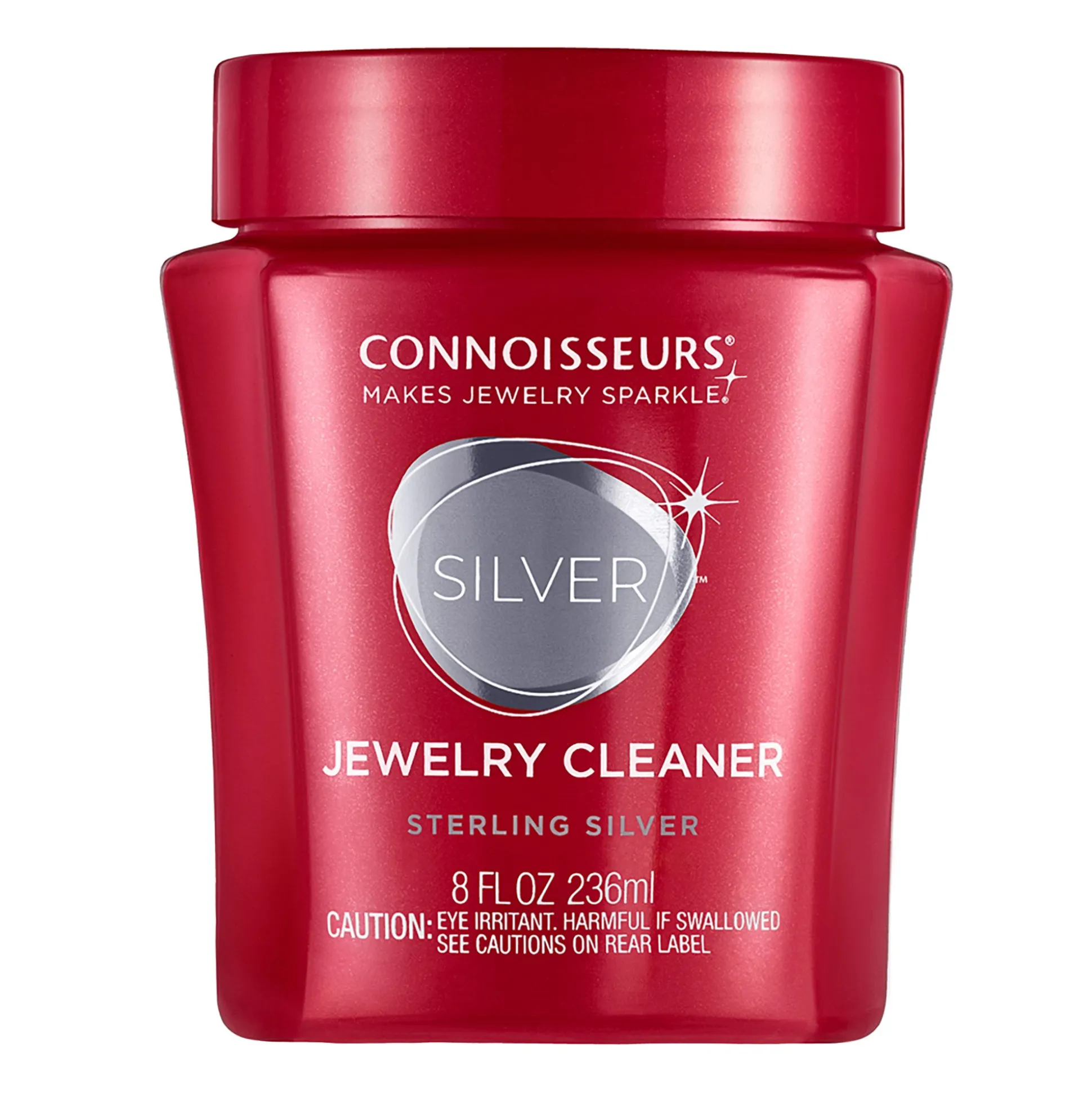Connoisseurs® Silver Jewelry Cleaner is a fast, convenient way to clean sterling silver jewelry. Instantly clean, remove tarnish and restore the shine and brilliance to sterling silver jewelry in just 10 seconds. Sterling Silver jewelry will tarnish when exposed to air. Skin oils, perfumes, and hairspray can speed up the tarnishing process. To keep your silver jewelry looking its best, regular cleaning is recommended. Not for use on gemstones, painted or antiqued or plated pieces and any other type of metal. Ammonia-Free. 8 fl. oz. Dip tray included.