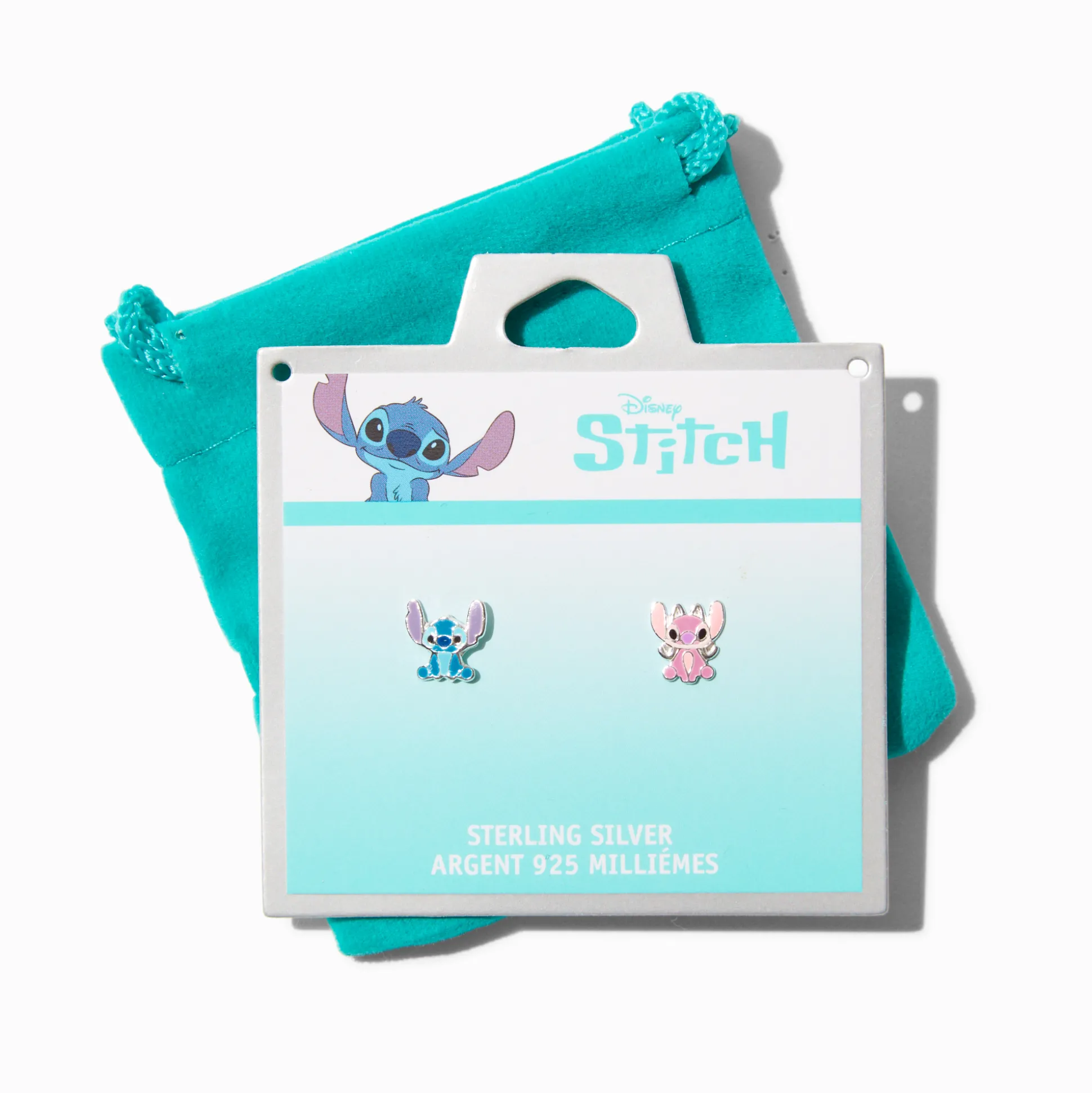 Show off your love for Disney’s Stitch and Angel with these stud earrings. The sterling silver designs have enamel Stitch and Angel shapes.