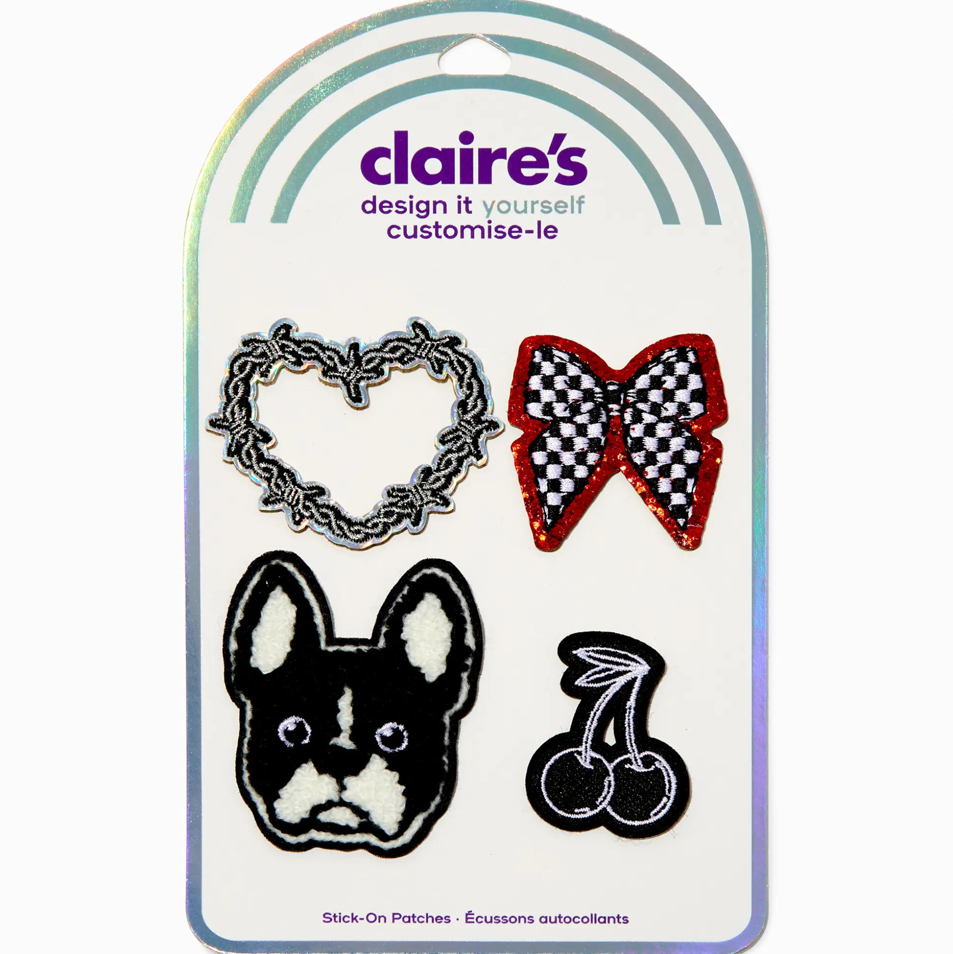 Decorate your water bottle, phone case, and more with these edgy stick-on patches. The four pack has a barbed wire heart, a checkered bow, a dog, and black cherries.