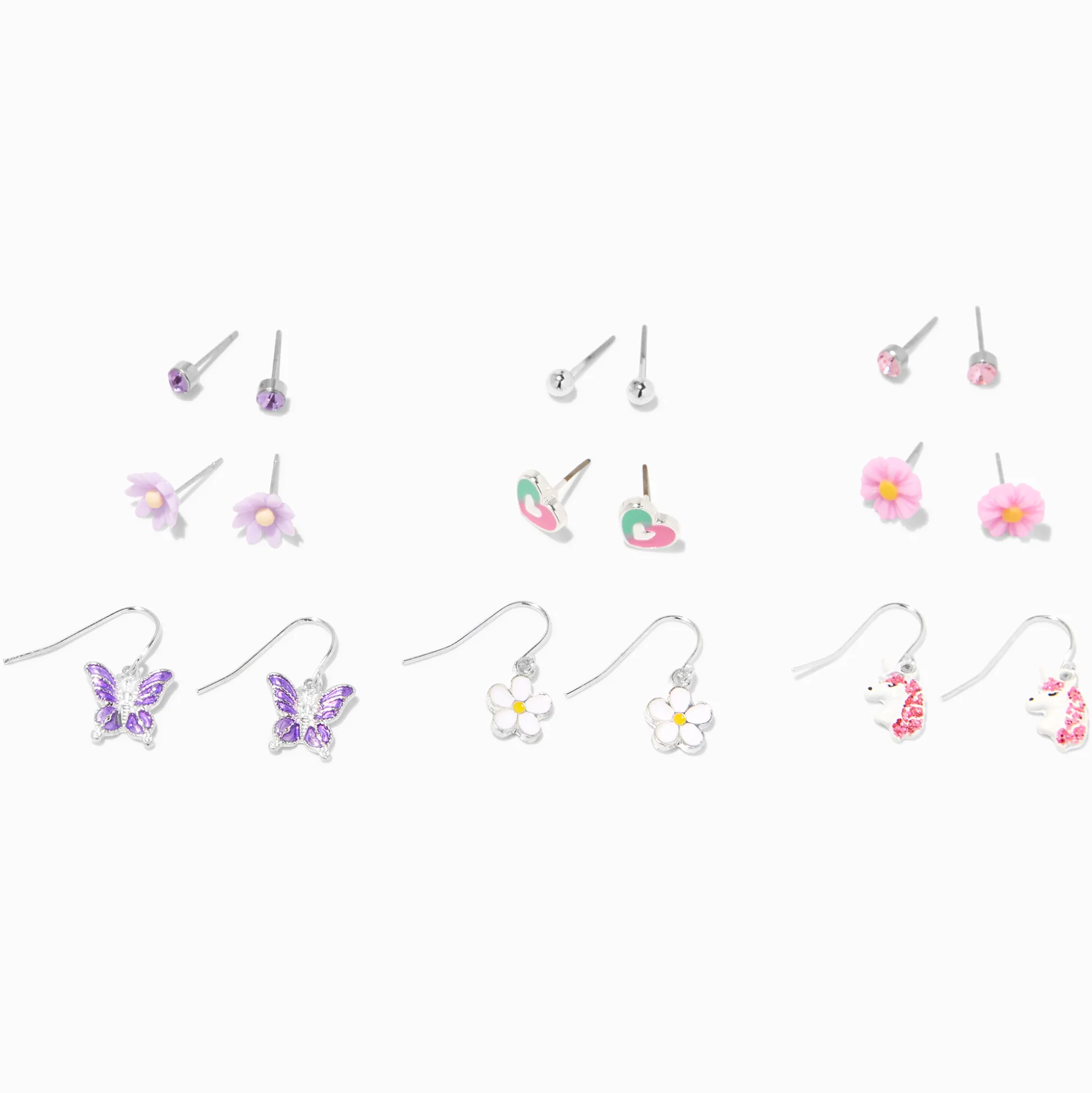 Expand your earring collection with butterflies and flowers! This silver-tone set includes six pairs of stud earrings and three pairs of dangly earrings designed with faux crystals, enamel flowers and butterflies.