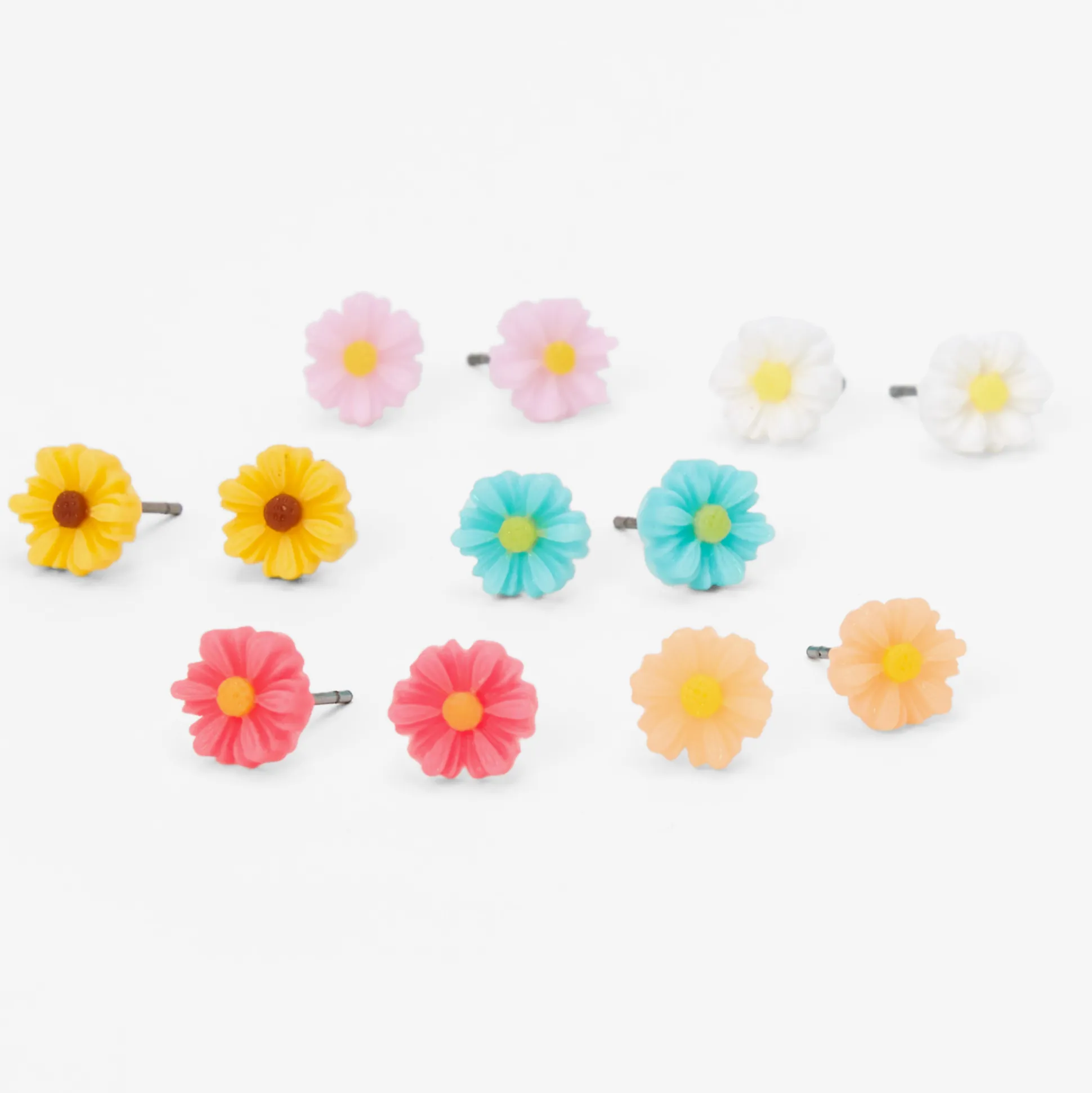 With so many pairs, these earrings give you your own garden. The studs all have different color flowers, including yellow, pink, purple, and more.