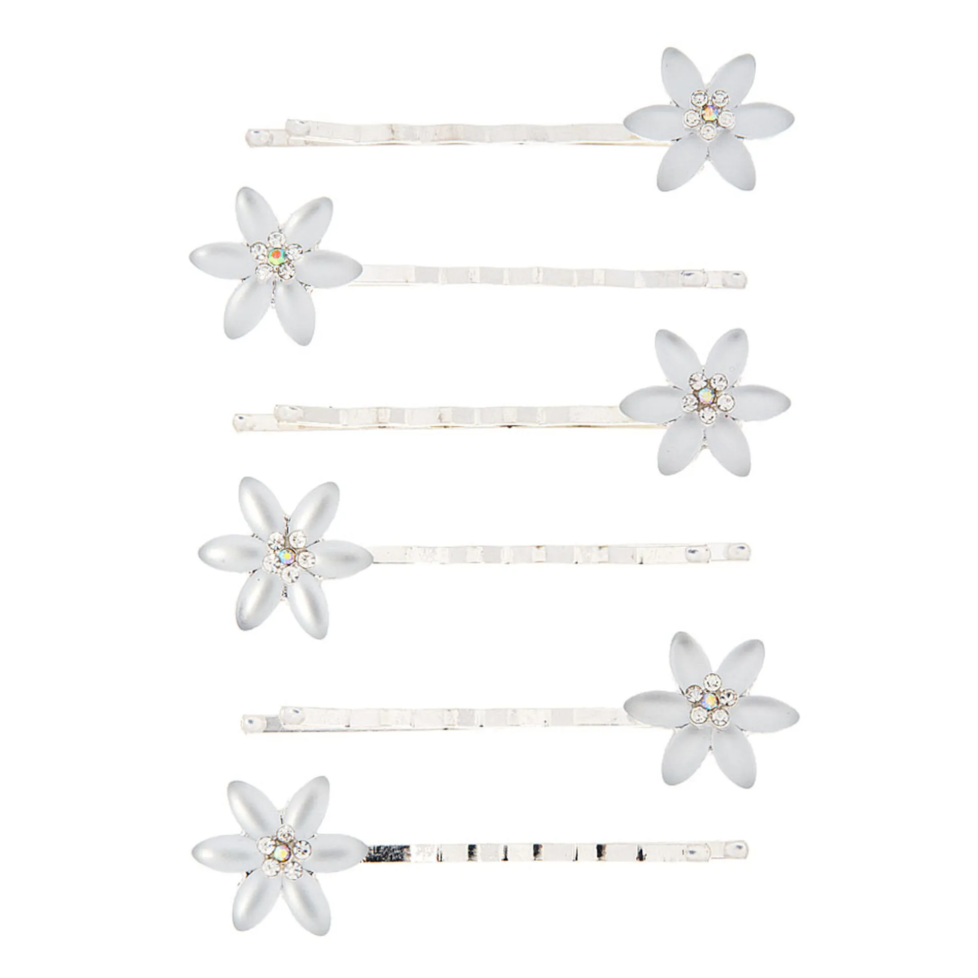 Tuck these pretty pins into hair for a flirty vintage look. Frosted marquis crystals form flowers with iridescent crystal centers on silver bobby pins.