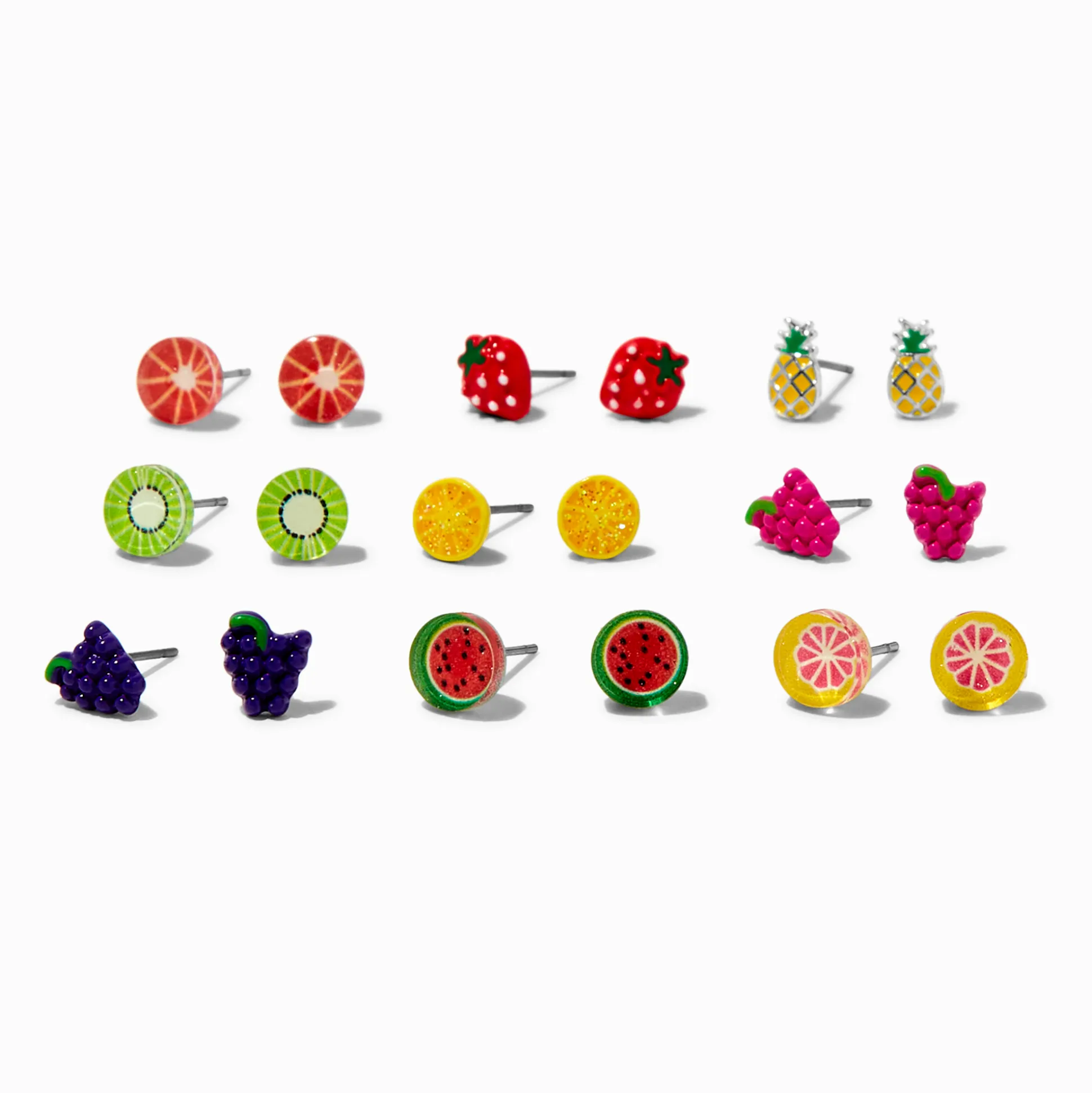 Always have the perfectly picked fruit studs with this 9-pack set. It includes oranges, strawberries, pineapple, kiwis, lemons, grapes, purple grapes, and grapefruit.