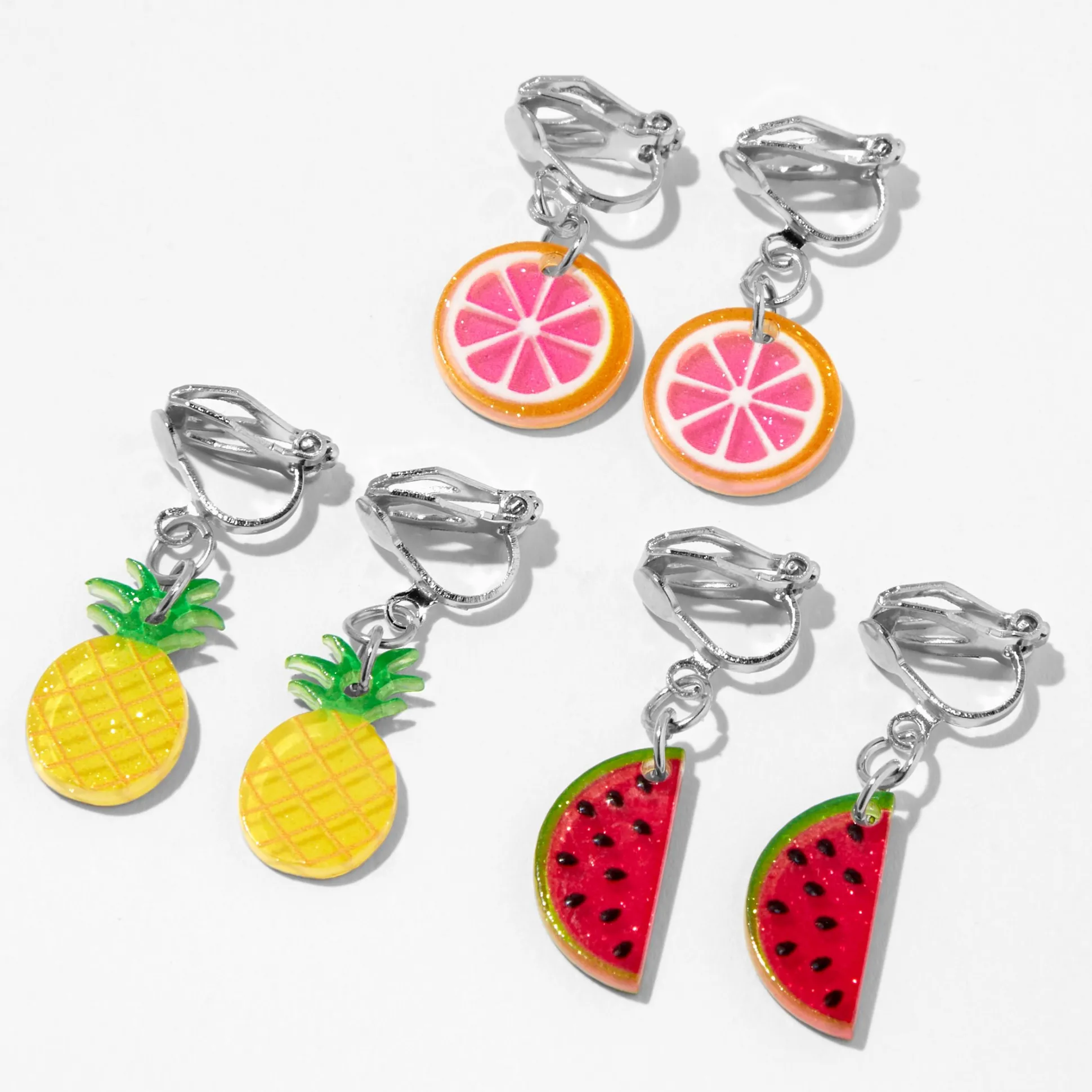 Your outfit will be fruity fresh with this set of super cute clip-on earrings! Set of three includes grapefruit, pineapple, and watermelon earrings – no piercing required!