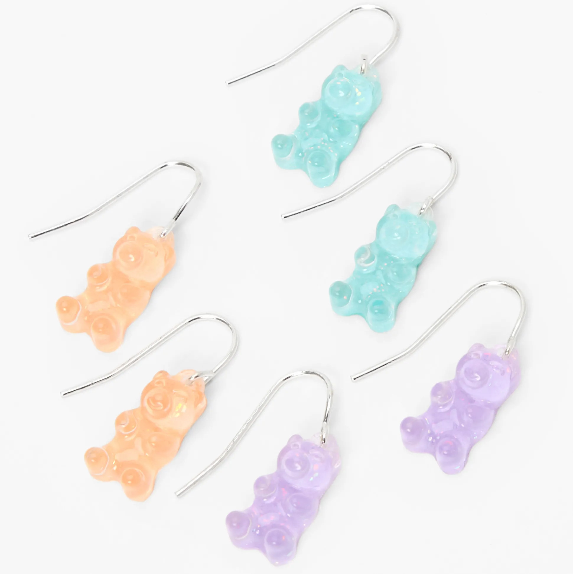 Look as cute and sweet as Gummy Bears® with these earrings! This set of glow-in-the-dark, drop earrings includes three pairs, with a Gummy Bears® charm dangling from each in pastel purple, blue, and orange.