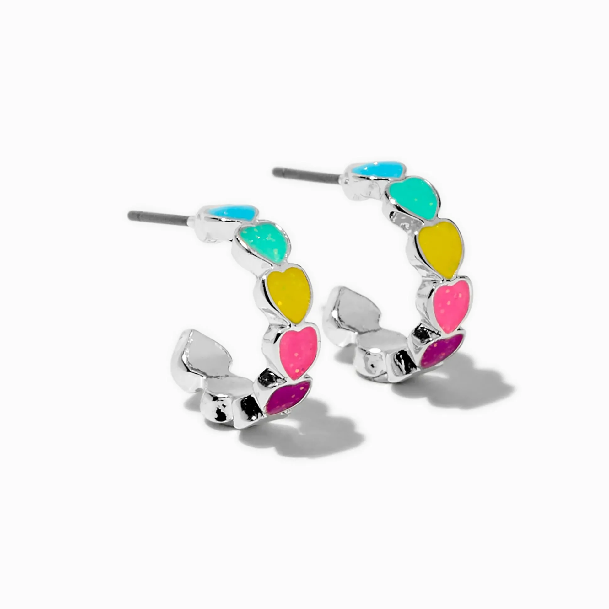 Create a heart-shaped rainbow moment in these hoop earrings. These earrings, which have rainbow-hued hearts all round, glow in the dark for added fun. Expose to light to help it to glow when it’s dark.
