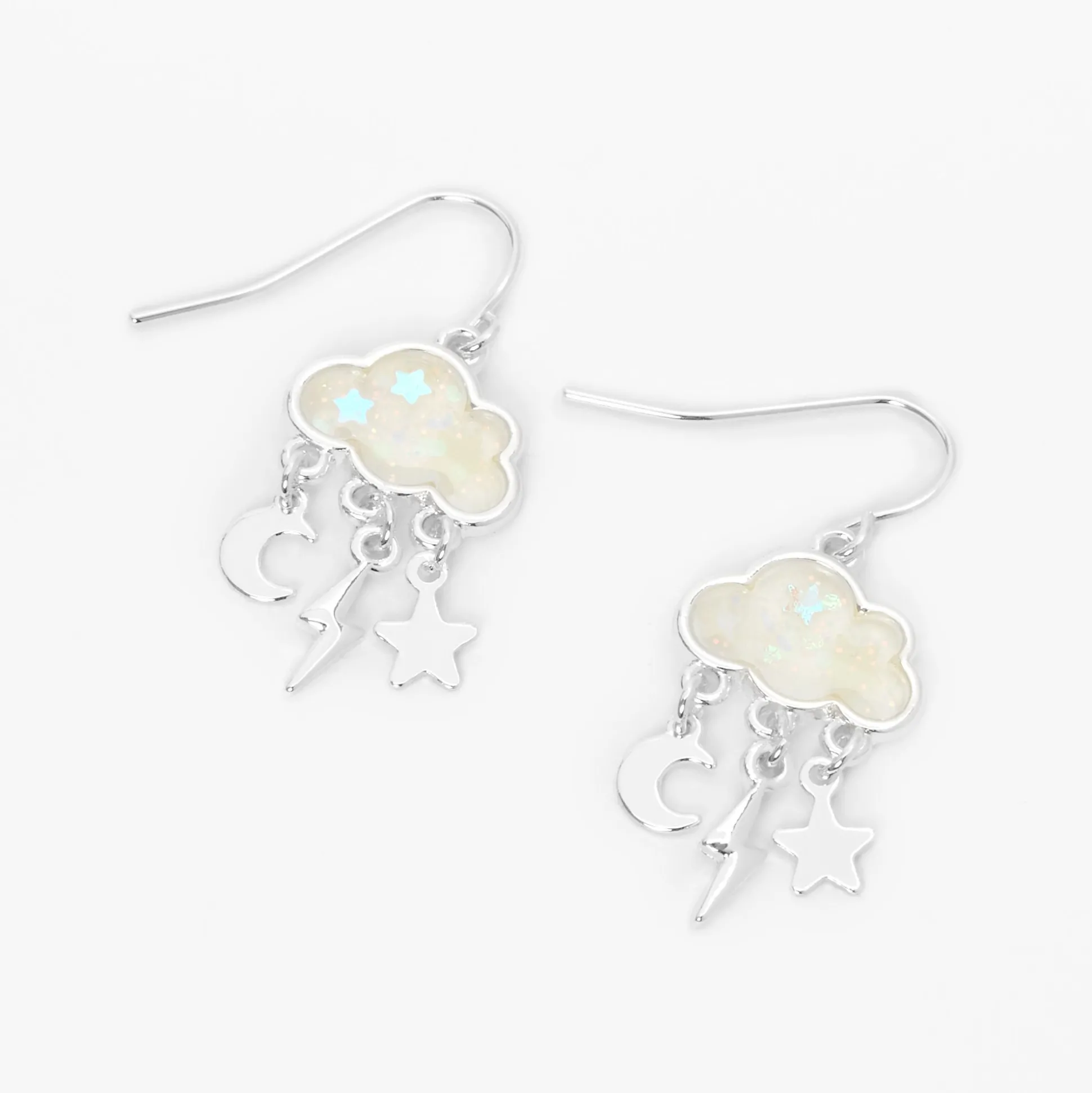 Show off your fascination for weather with these charming drop earrings. The silver-tone beauties have glow-in-the-dark clouds with moon, lightning, and star dangling charms. Wear these in whatever’s the weather.