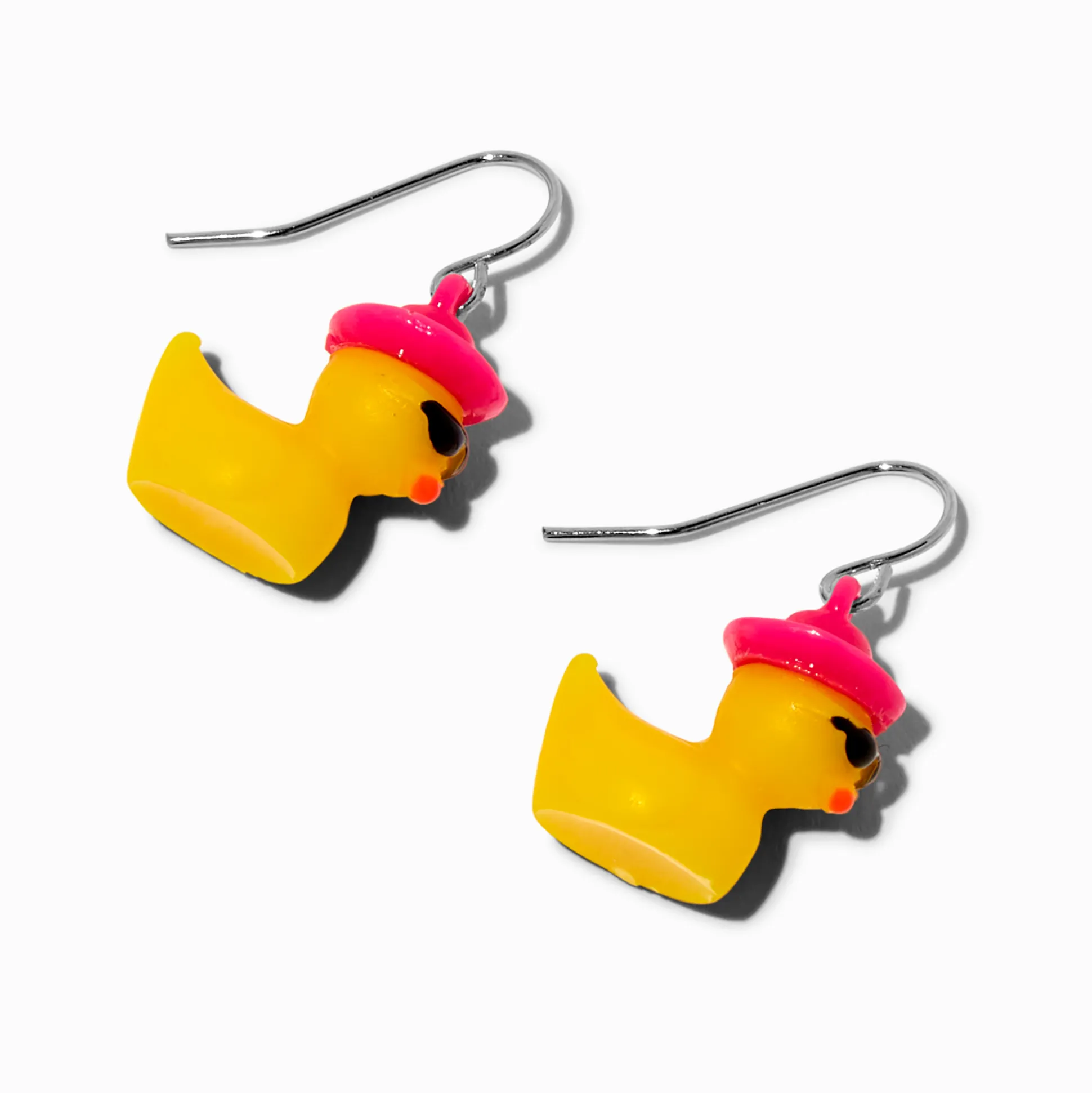 Create a glow-in-the-dark vibe with these silver-tone drops. Each has a cowboy, yellow rubber duck pendant that glows in the dark. For best results, expose the glow-in-the-dark pendants to the light.