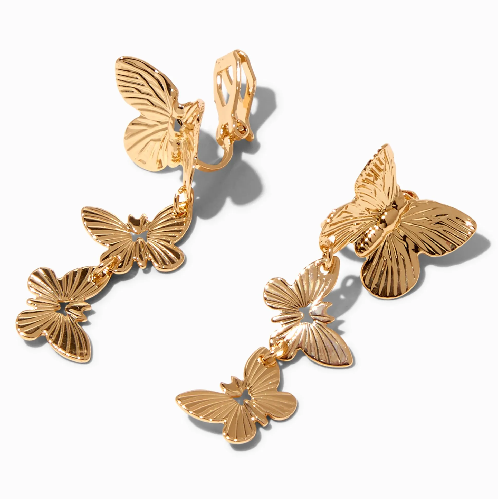Delicate gold-tone butterflies come to life on these gorgeous clip-on drop earrings. Two textured butterflies with a center cut-out design dangle from a larger butterfly that will rest lightly on your earlobe with a convenience clip-on back.