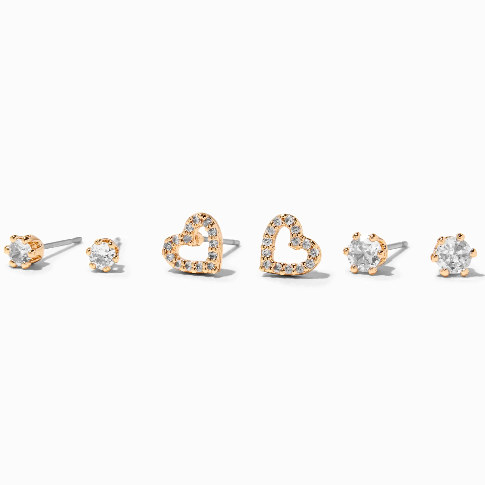 Nothing beats a pair of sparkly cubic zirconia studs! This gold-tone three-pair set includes cutout heart studs and two different sized round studs you can mix up your look to suit your mood.
