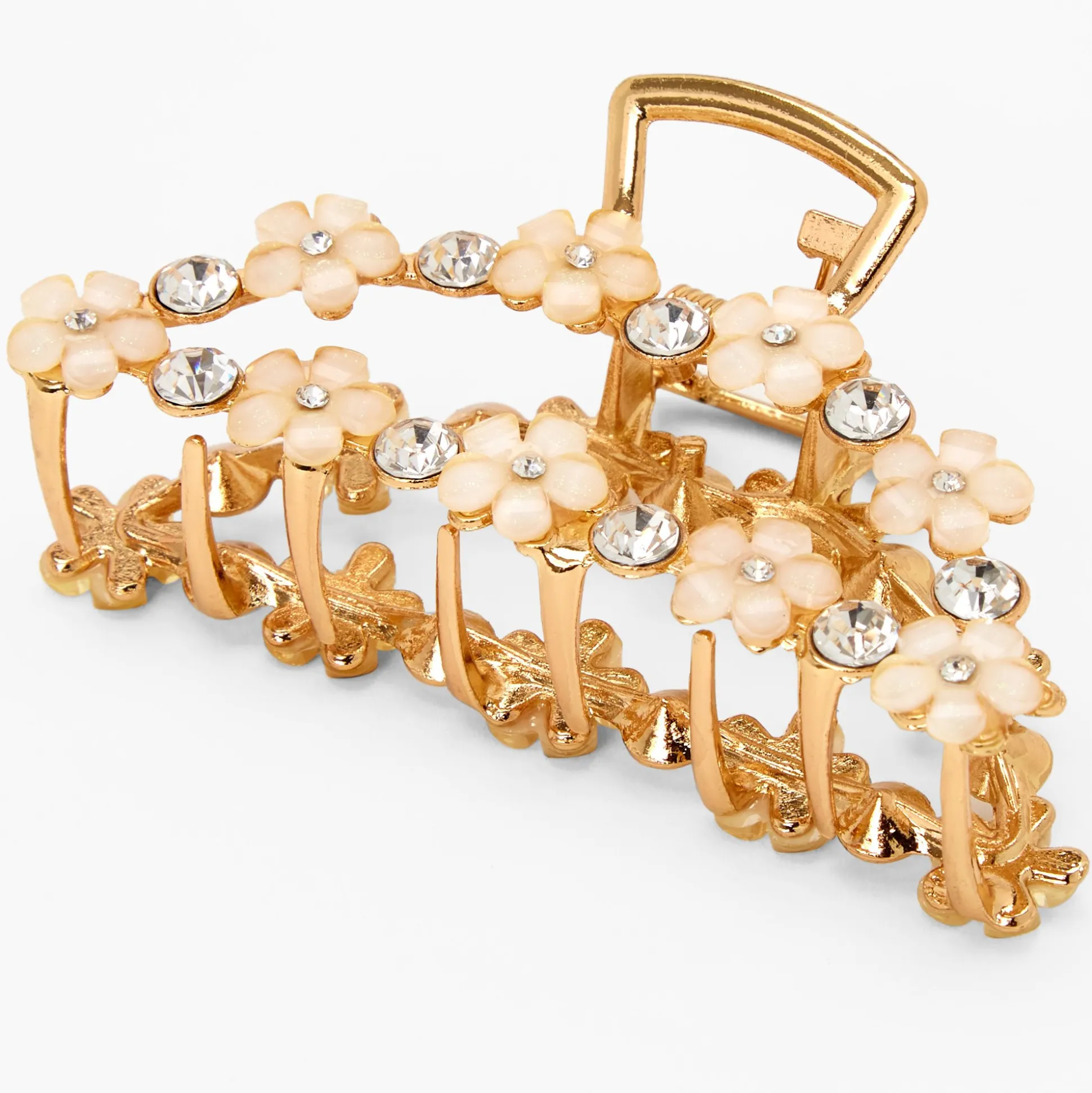 With rows of lovely faux rhinestones and daisies, this gold-tone hair claw instantly goes from casual to elegant! The sturdy hinge will keep your ‘do in place all day at school or work, or during an evening out.
