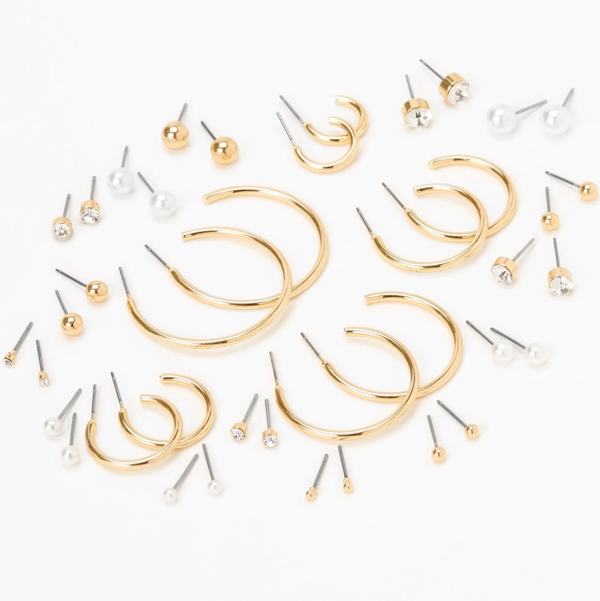 The perfect pair of earrings for every occasion! This versatile gold-tone set includes faux pearl studs, ball studs, classic hoops, and bezel-set faux crystal studs, each in five graduated sizes.