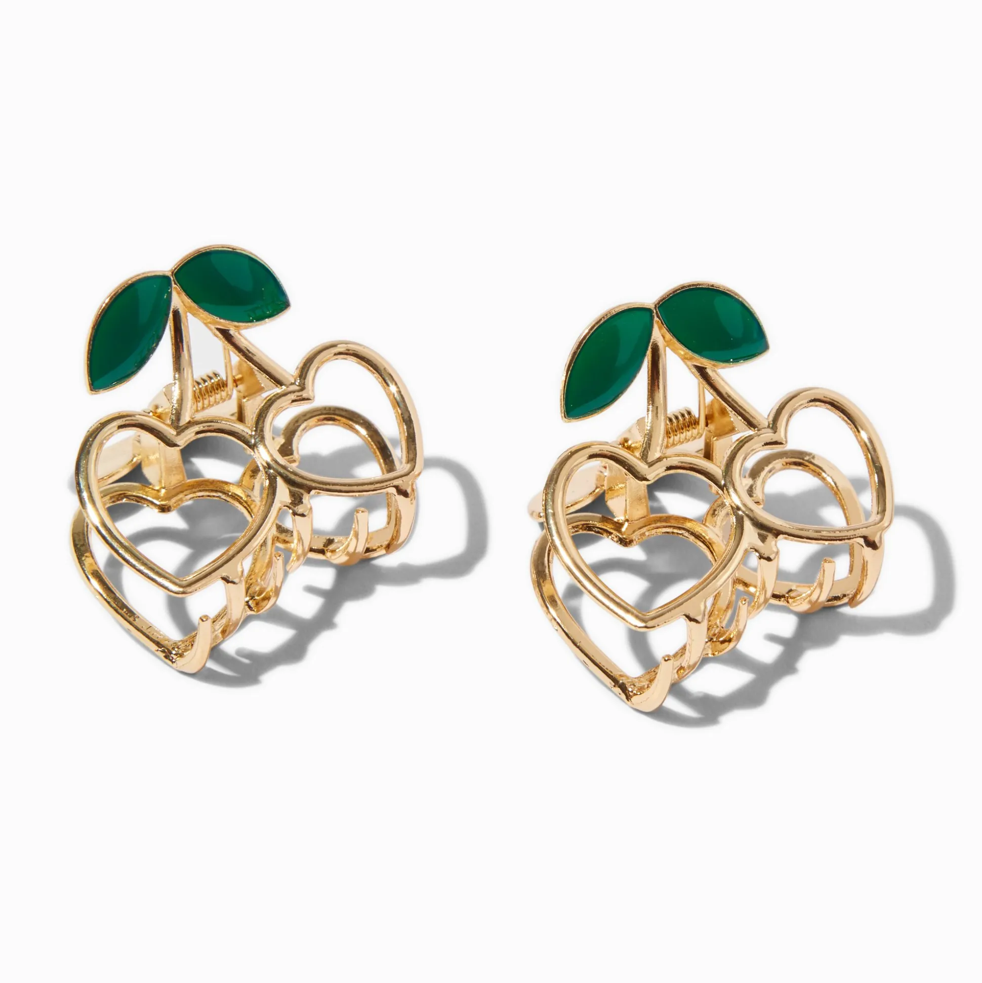 Hair claws make it so easy to achieve the perfect updo! This fun set has two heart-shaped cherry hair claws. Wear one at a time, or wear them both.