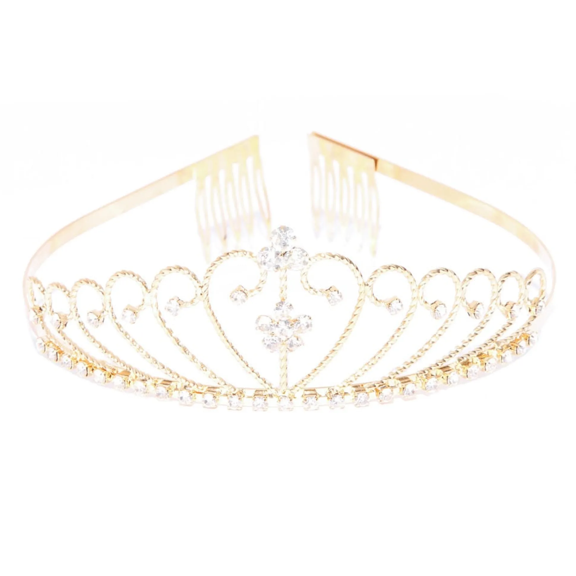 Sparkle like a princess in this gold tiara. Encrusted with diamantes and crystals and a daisy centerpiece. Held in place with two hair combs