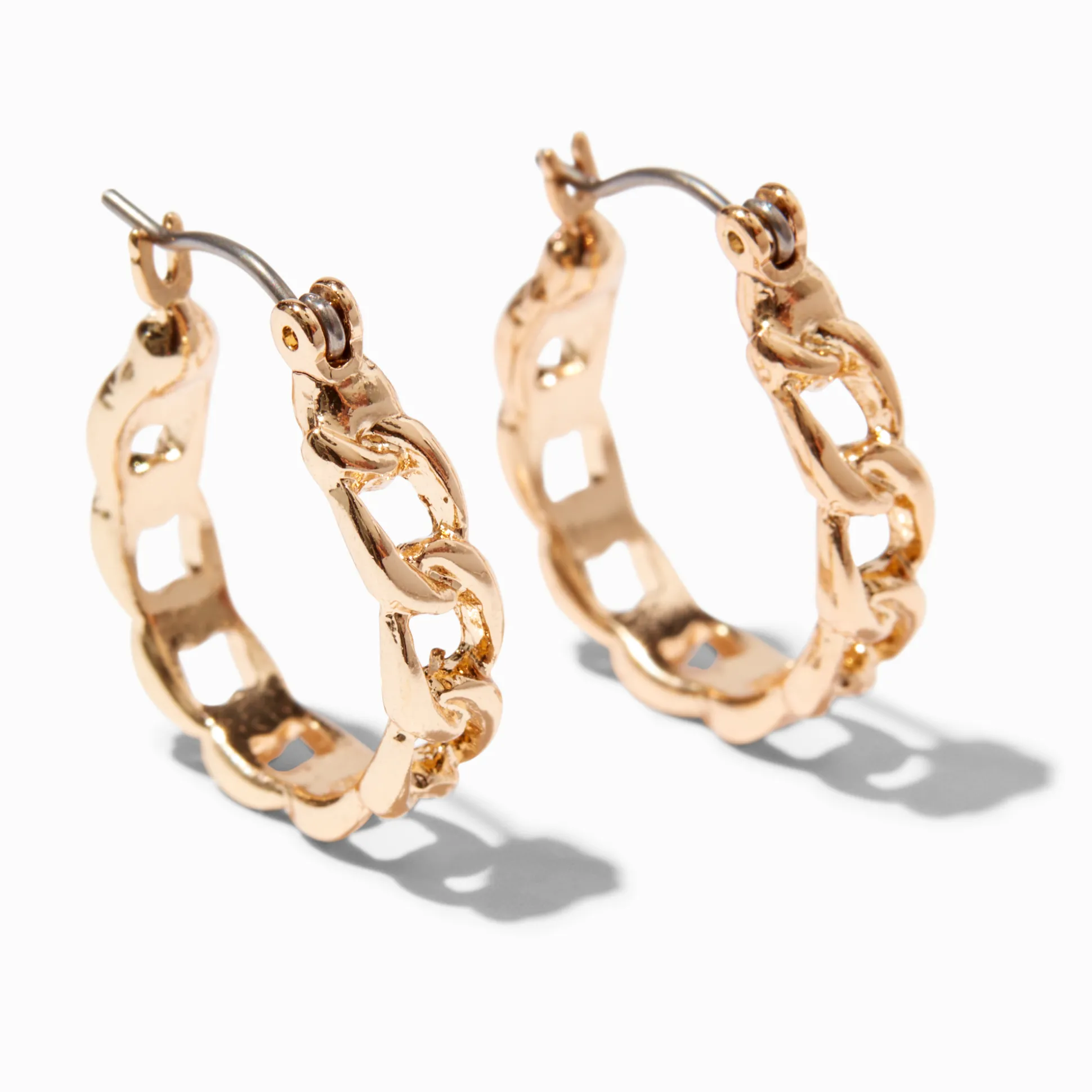 Your look will be off the chain! With a chainlink design, these gold-tone hoops upgrade your look with industrial-inspired style. The hoops have an easy hinge snap.