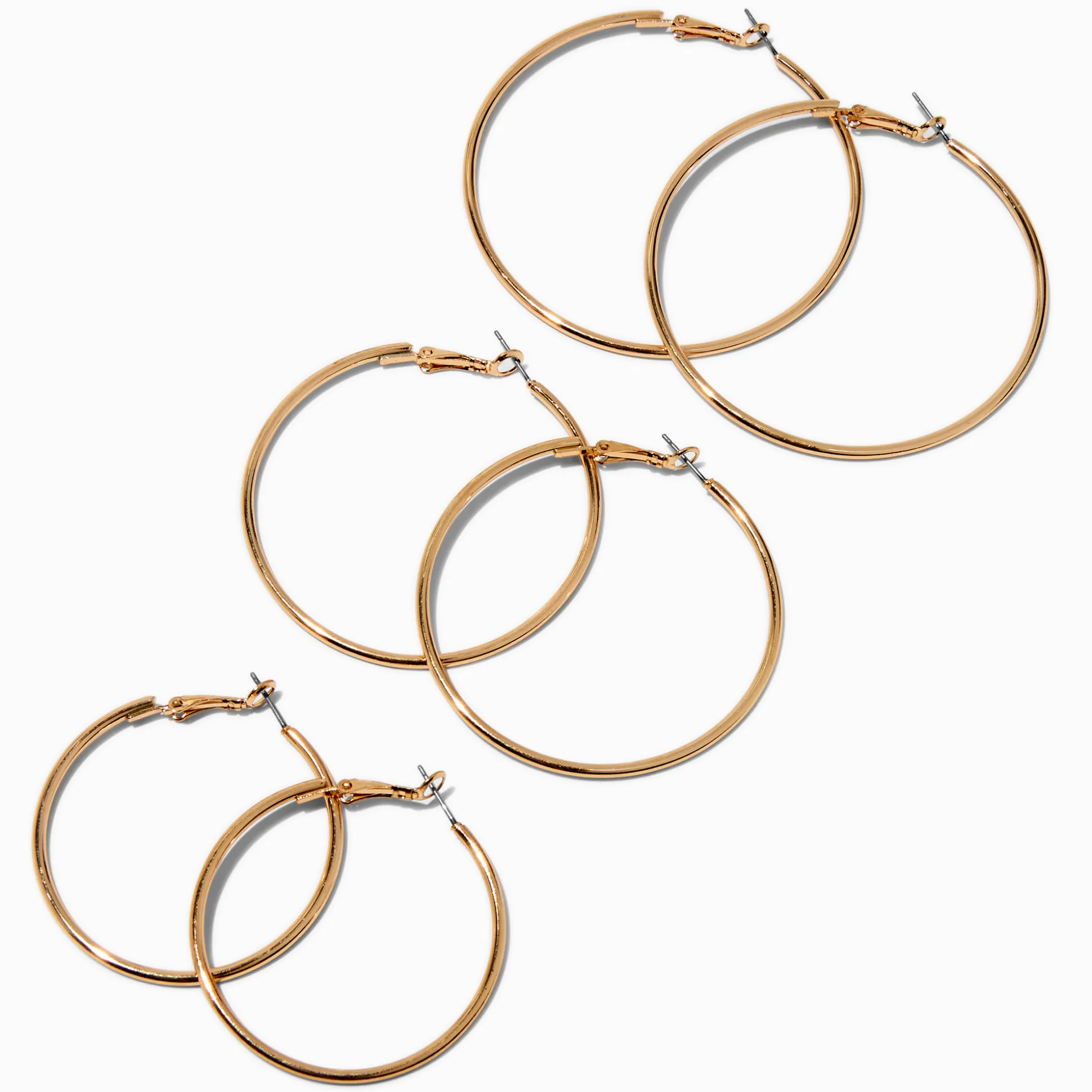 Classic hoops come in three graduated sizes with this set of earrings. The smooth hoops have a gold finish and rounded edges for a chic look. Includes one of each: 40mm, 50mm, 60mm.