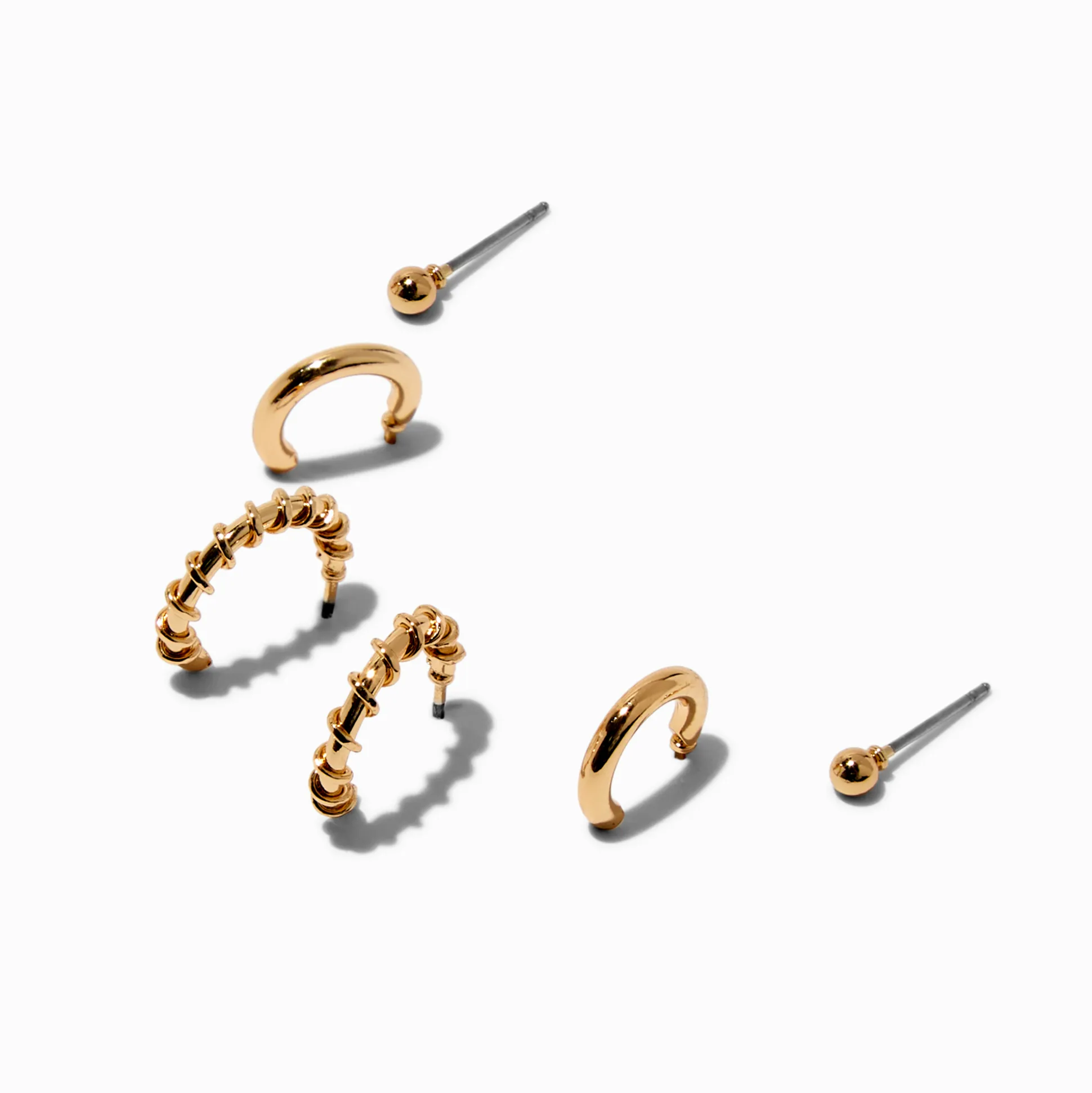 Show off your multiple ear piercings with this gold-tone set. The three pack includes twisted barbed wire hoops, thick hoops, and coordinating studs.