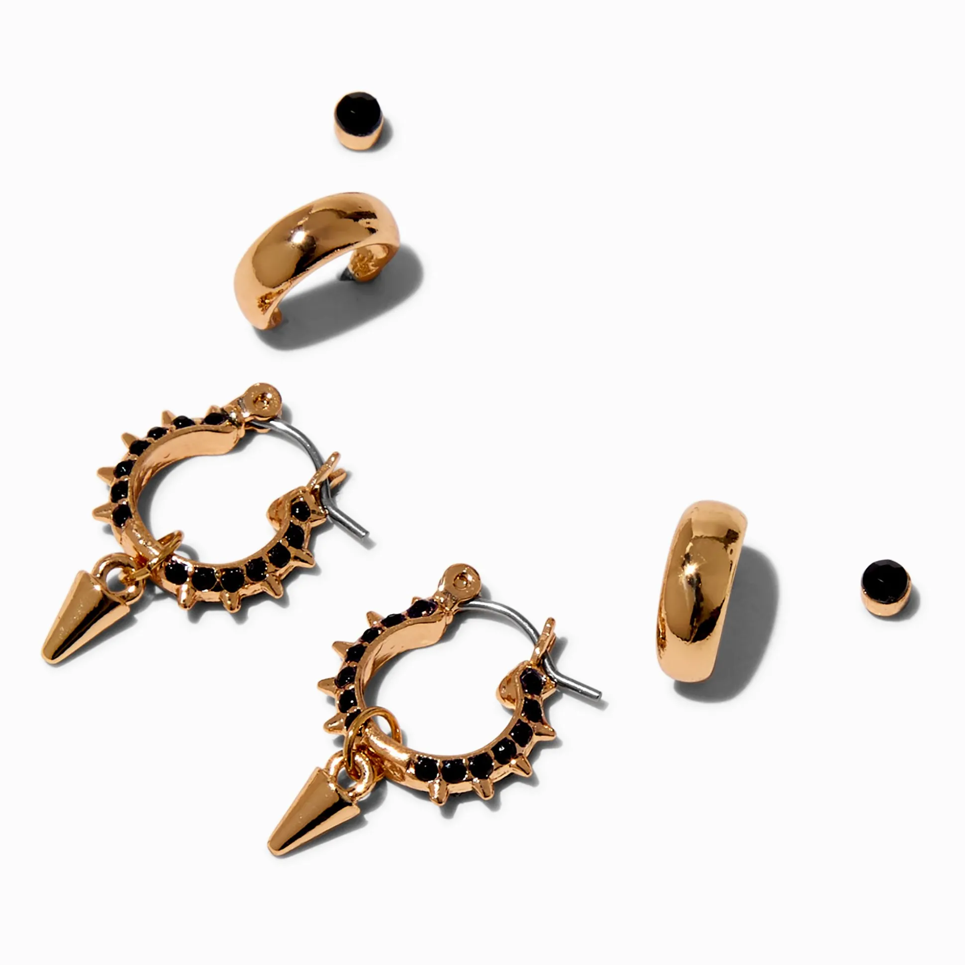 It’s an ear party, and you’re invited! Show off your multiple ear piercings with this gold-tone stackable set. The three-pack includes faux black crystal-embellished spiky hoops, smooth hoops, and black bezel-set studs. Wear them all together or one pair at a time.