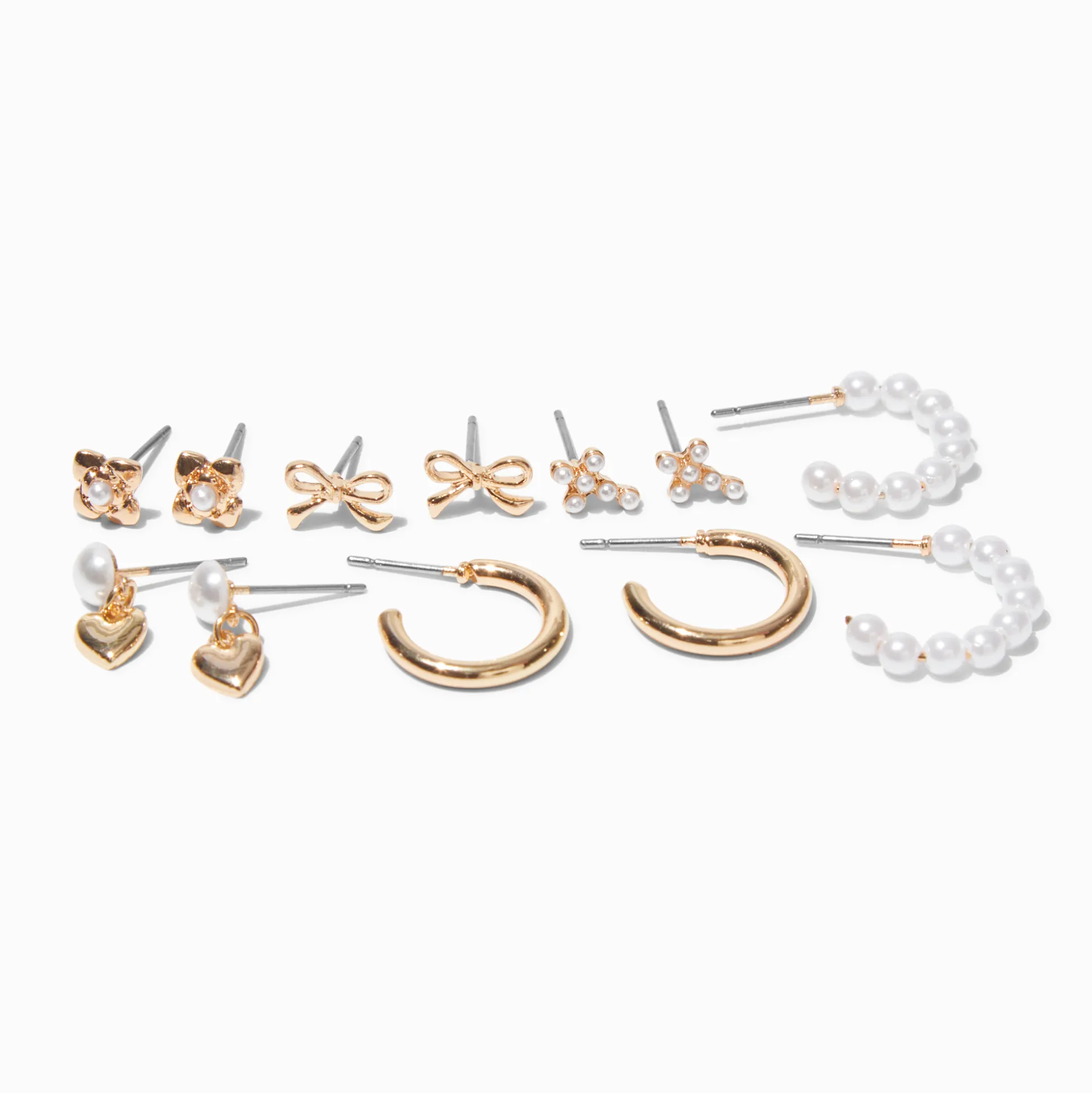 Always have the perfect pair of earrings with this expansive set. The 6 pack includes gold-tone and pearl icons, like: bows, hoops and more.