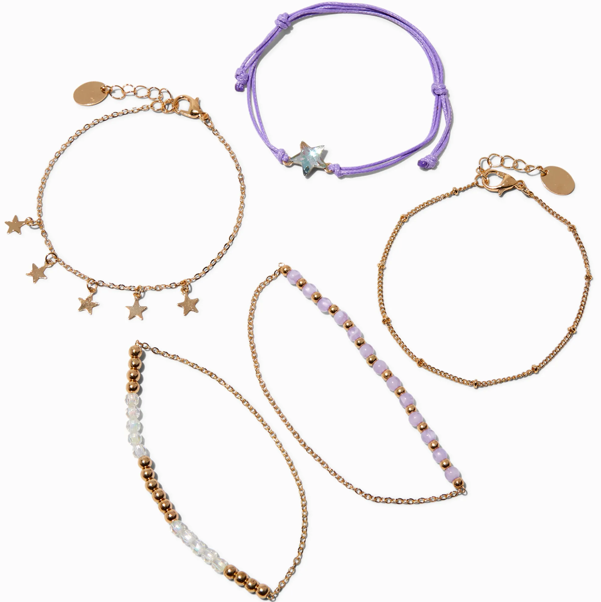 Give yourself options with this five-piece bracelet set. Purple beads and gold-tone star details combine for celestial charm. Wear one or stack them to create a look that’s all your own.
