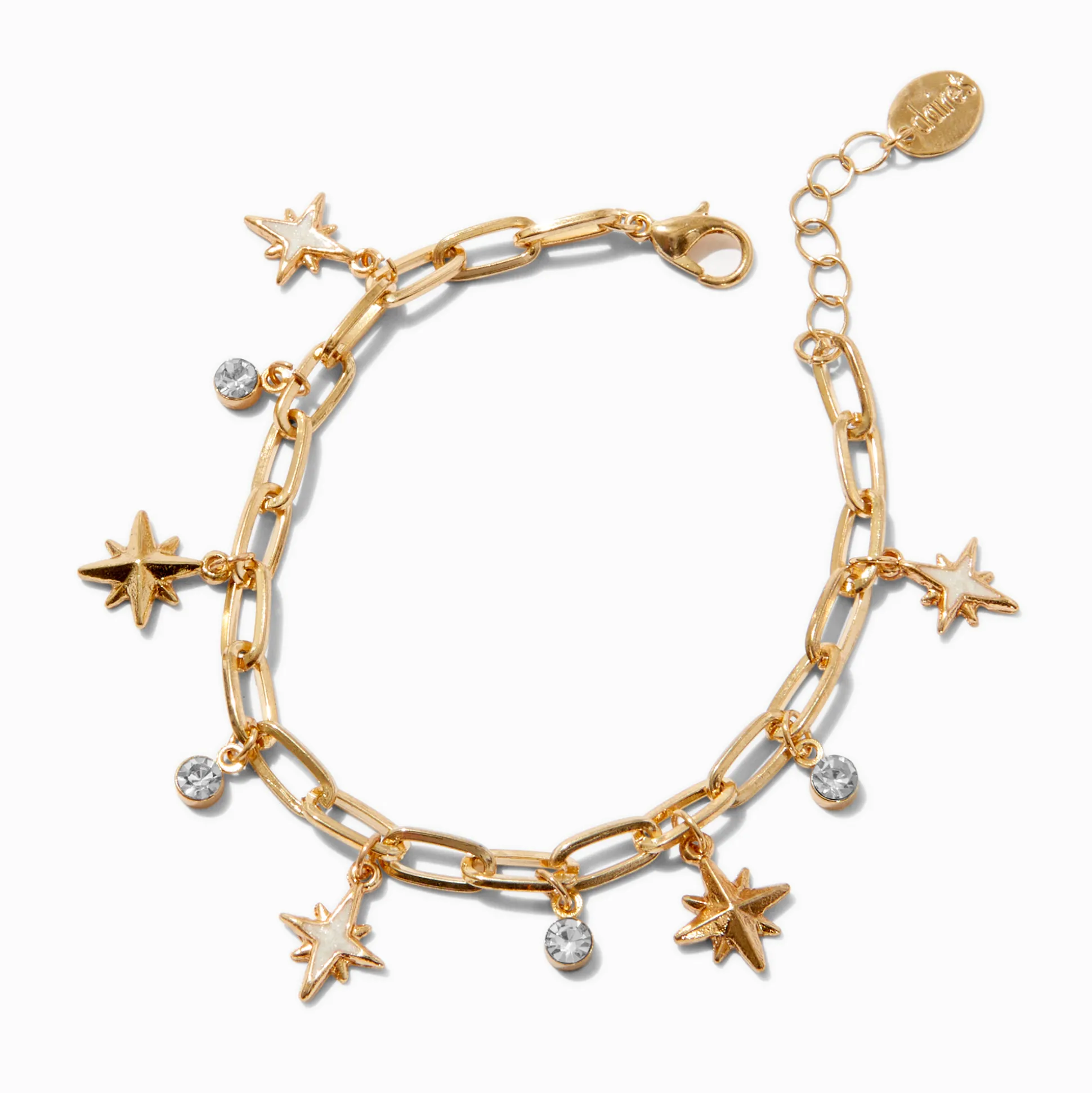 Create a star-studded look around your wrist with this gold-tone charm bracelet. The paper clip-style chain is finished with nine charms including stars and bezel-set faux crystals.