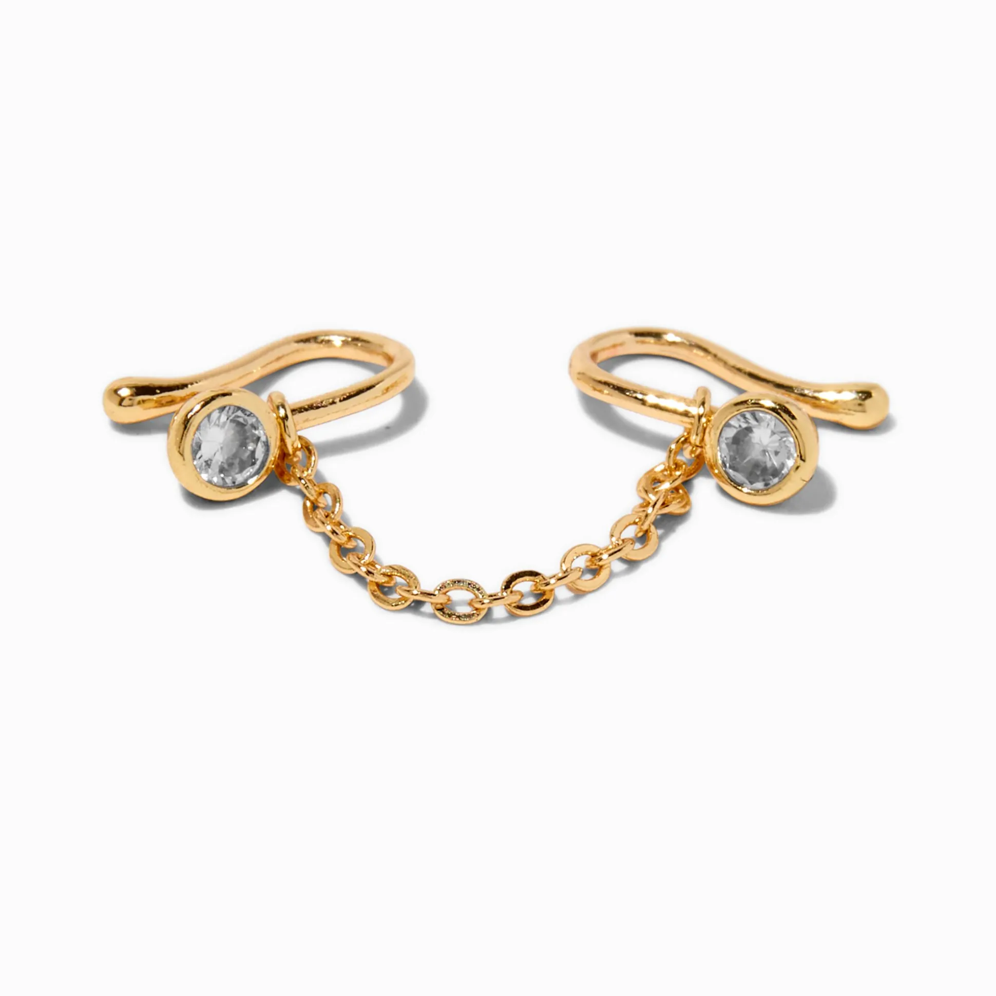 Make your look off the chain with no piercing necessary! Faux nose ring features a double clip design that’s connected by a chain and accented by cubic zirconias.