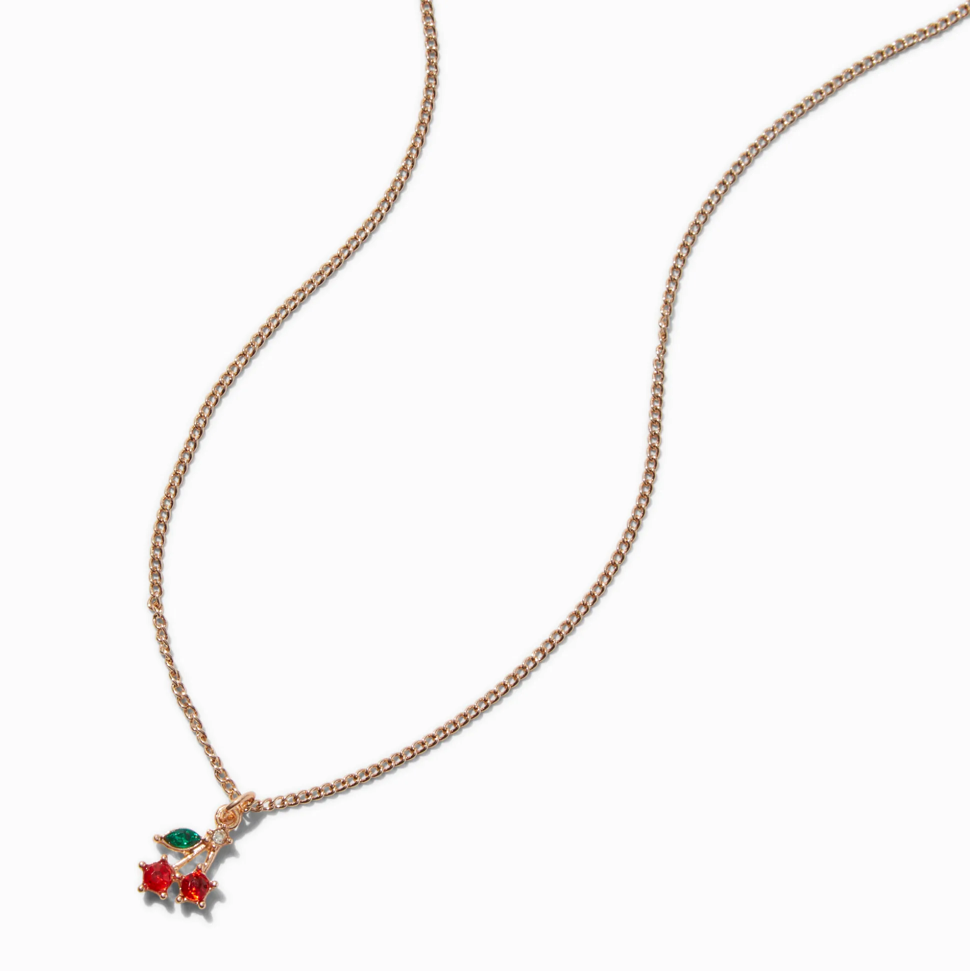 Create a cheerful cherry moment with this pendant necklace. The gold-tone chain has a dainty cherry pendant that’s covered in faux crystals.