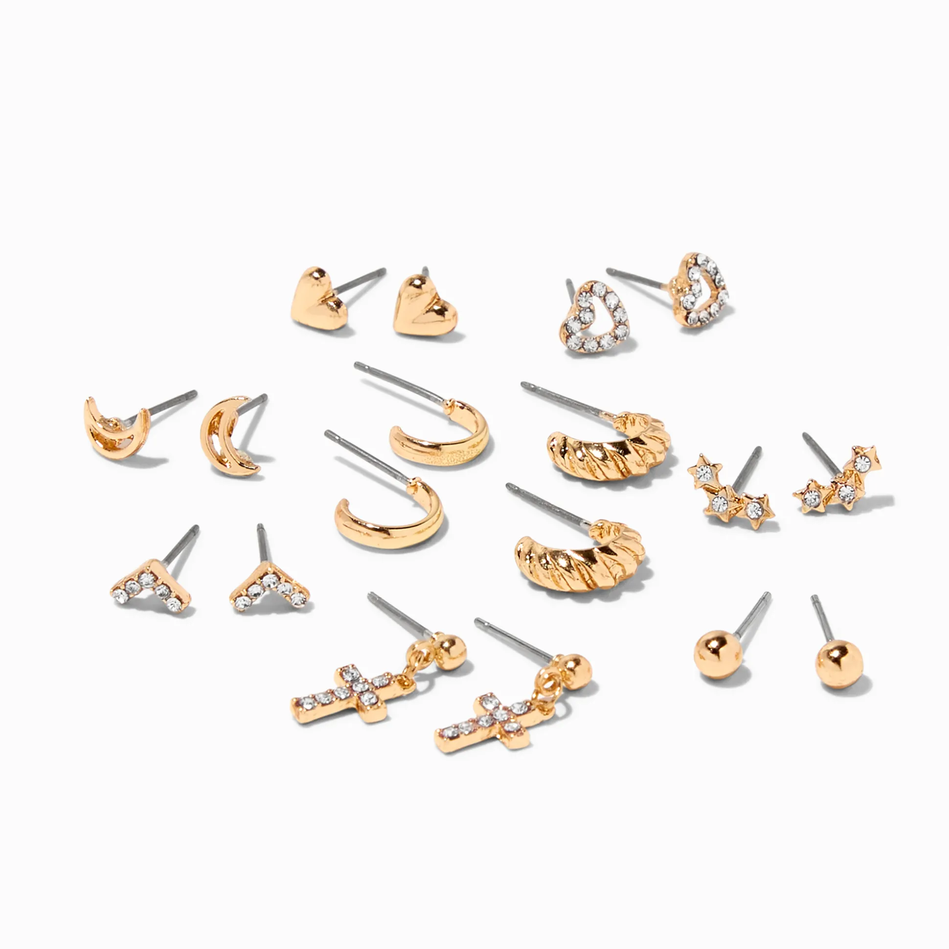 This expansive earring set lets you embrace your own style. The nine-pack set has trendy, fashion-forward options in stunning gold-tone. Designs include moons, hearts, crosses, stars, balls, and huggie hoops. Mix and match or wear a different pair every day for nine days! That’s a pretty long time with no repeats.