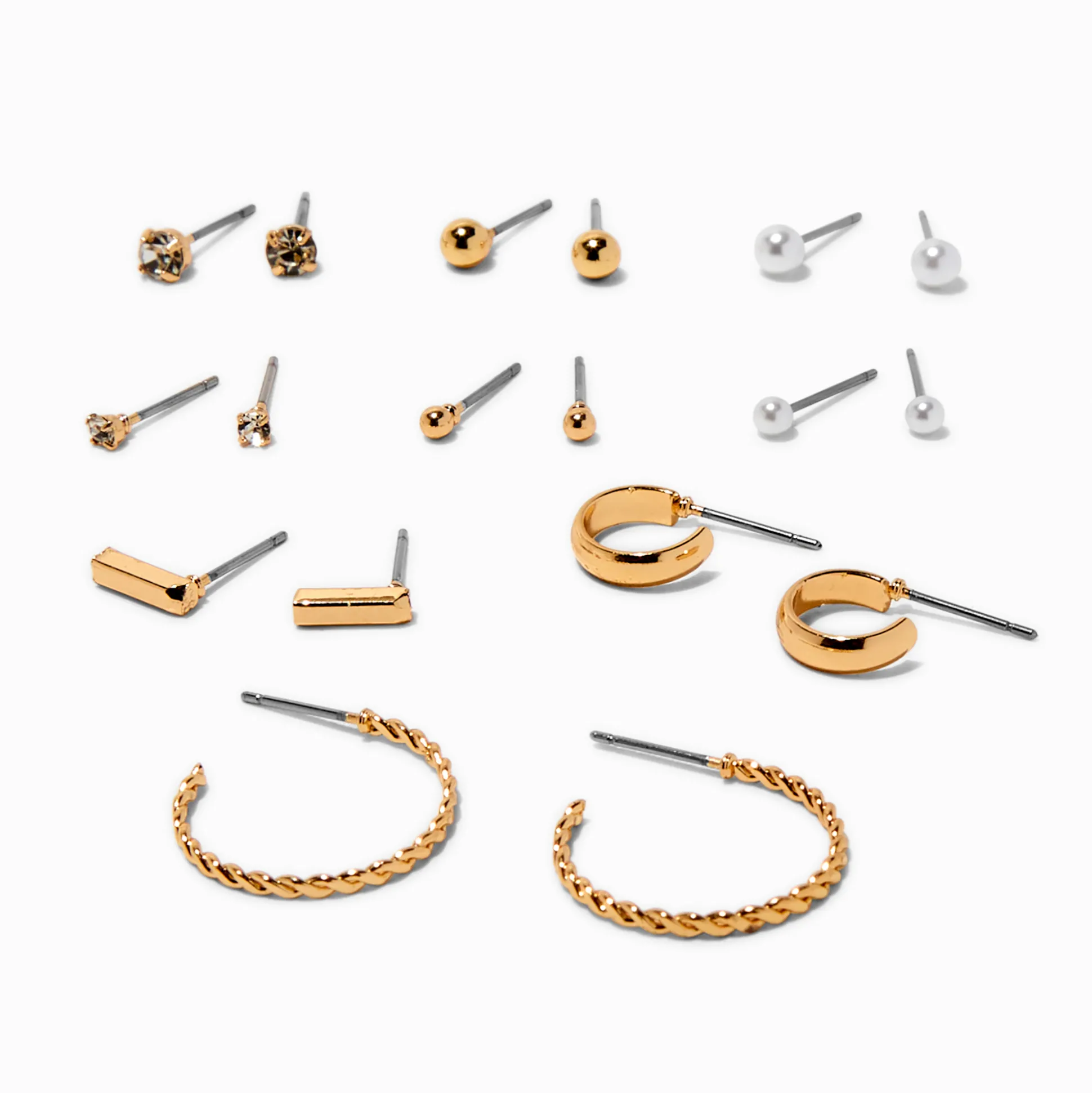 Always have the perfect pair of earrings with this expansive set. The 9 pack includes balls, faux pearls, faux crystals, rectangles, and two different sized hoops, so you have a lot of choices.