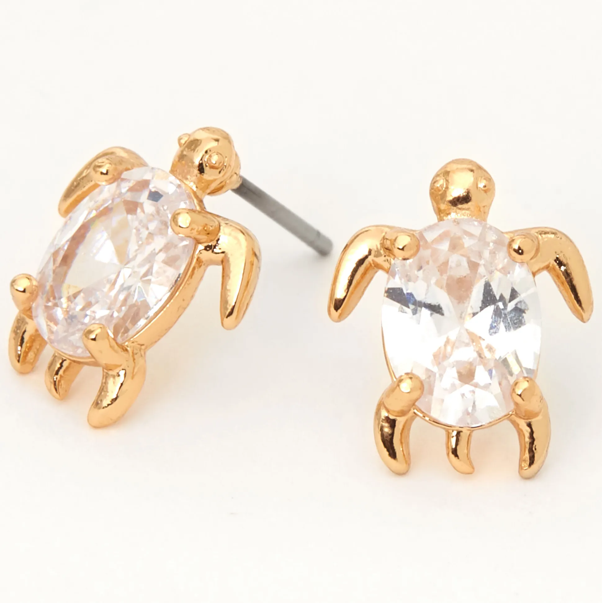 Show off your love for turtles with this pair of earrings! These gorgeous gold-tone turtles feature an oval shaped cubic zirconia stone as shells on each stud.