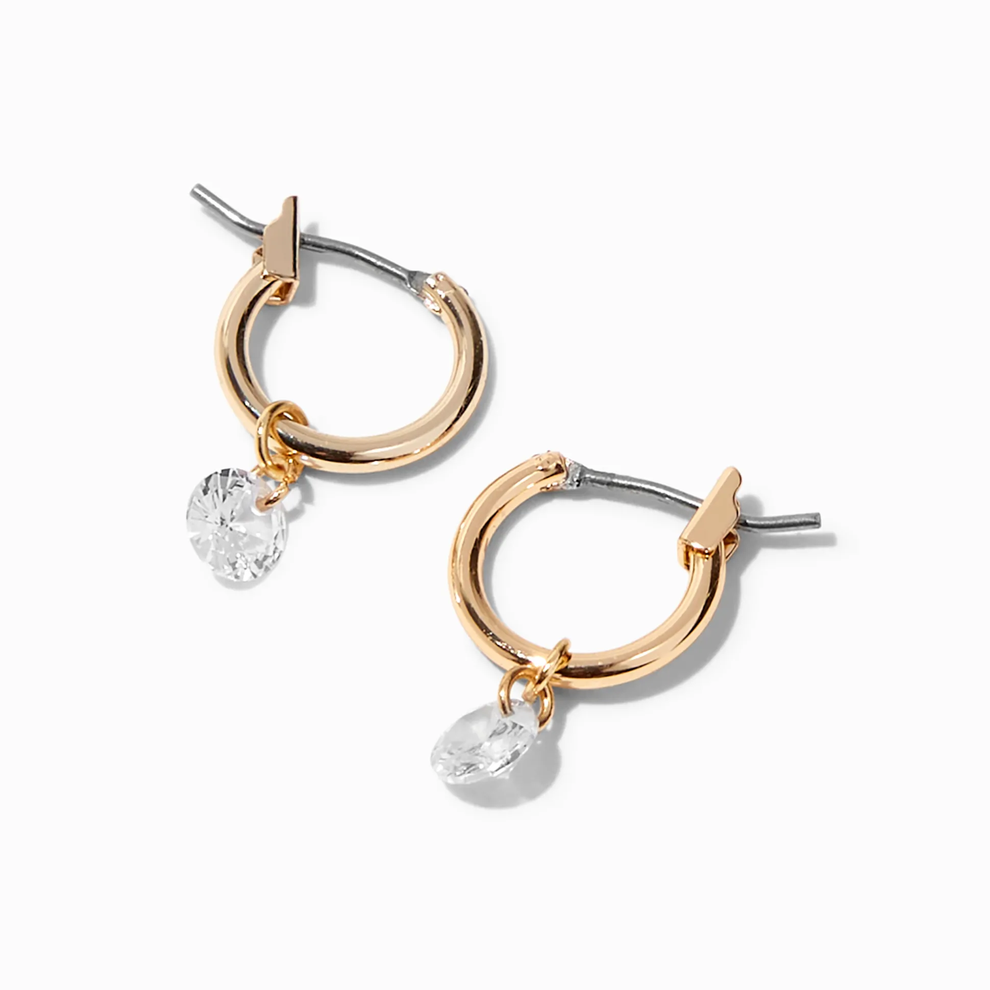 Look absolutely charming in these huggie hoop earrings. Each gold-tone earring has a cubic zirconia charm and an easy hinge snap closure.