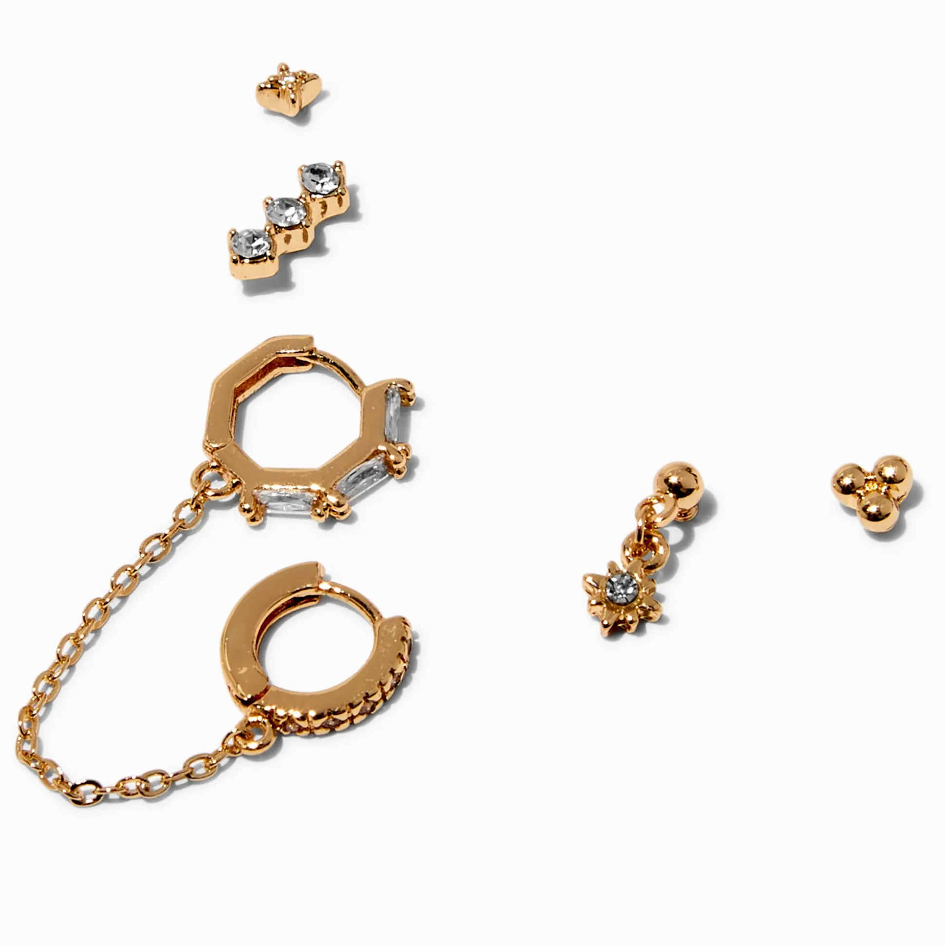 You’re invited to an ear party! These three pairs of earrings coordinate perfectly together if you have multiple piercings and want to stack on your ears. They feature sparkling cubic zirconia stones and shimmering faux crystals.