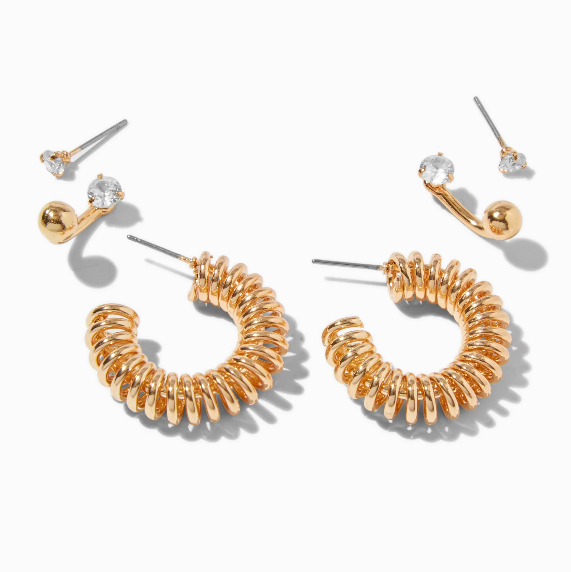 Show off your multiple ear piercings with this gold-tone set. It includes huggie hoops with a coil design, front & back ball earrings and studs. Wear these all together or however you’d like. You’re handing out the ear party invites.