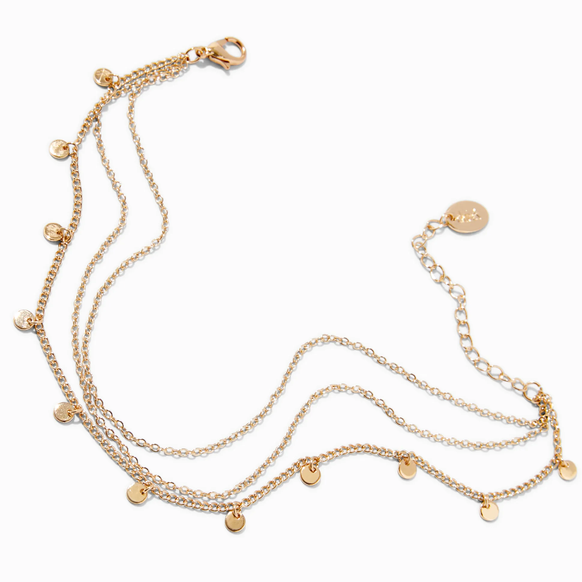 Your summer look isn’t complete until you’re wearing a super cute anklet! This gold-tone multi-strand design has three strands of chains with one accented with disc charms.