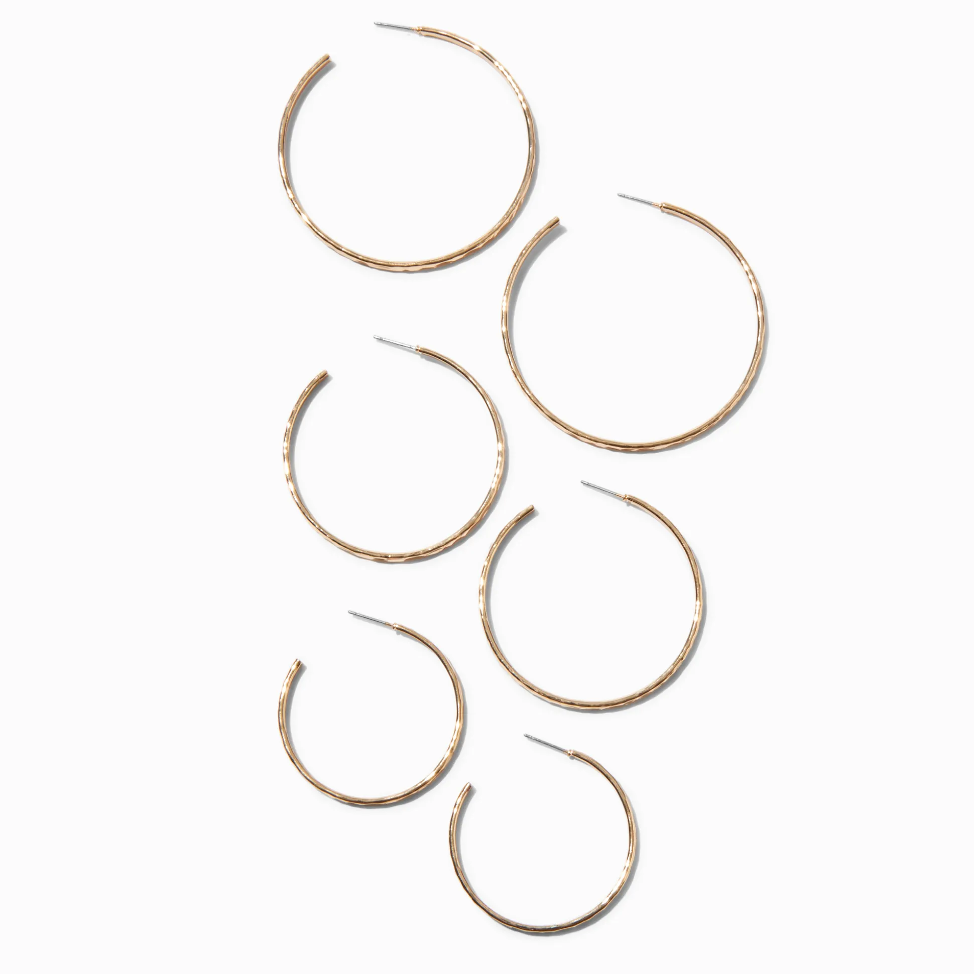 Always have the right sized hoops with this set of hoop earrings! Dress them up or dress them down, these gold-tone hoops have a hammered finish.