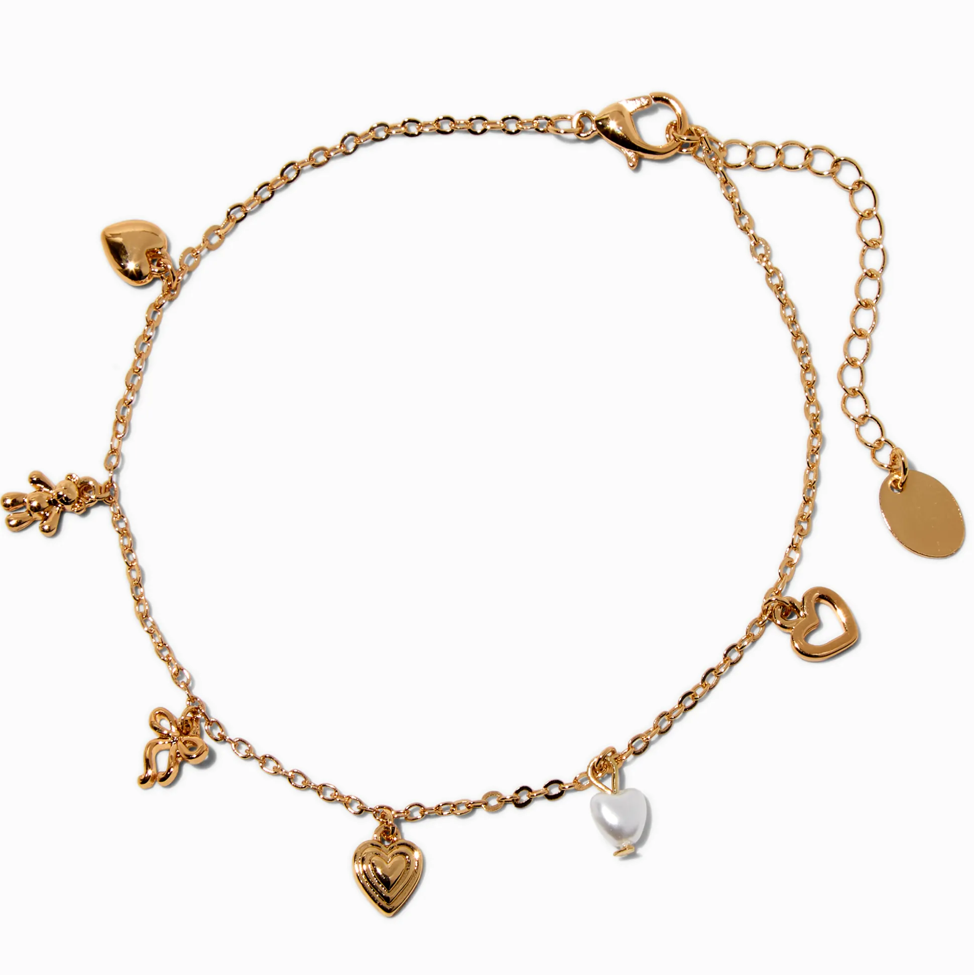 Your summer look isn’t complete until you’re wearing a trendy anklet! This gold-tone chain is decorated with heart, pearl, bows, and teddy bear charms.