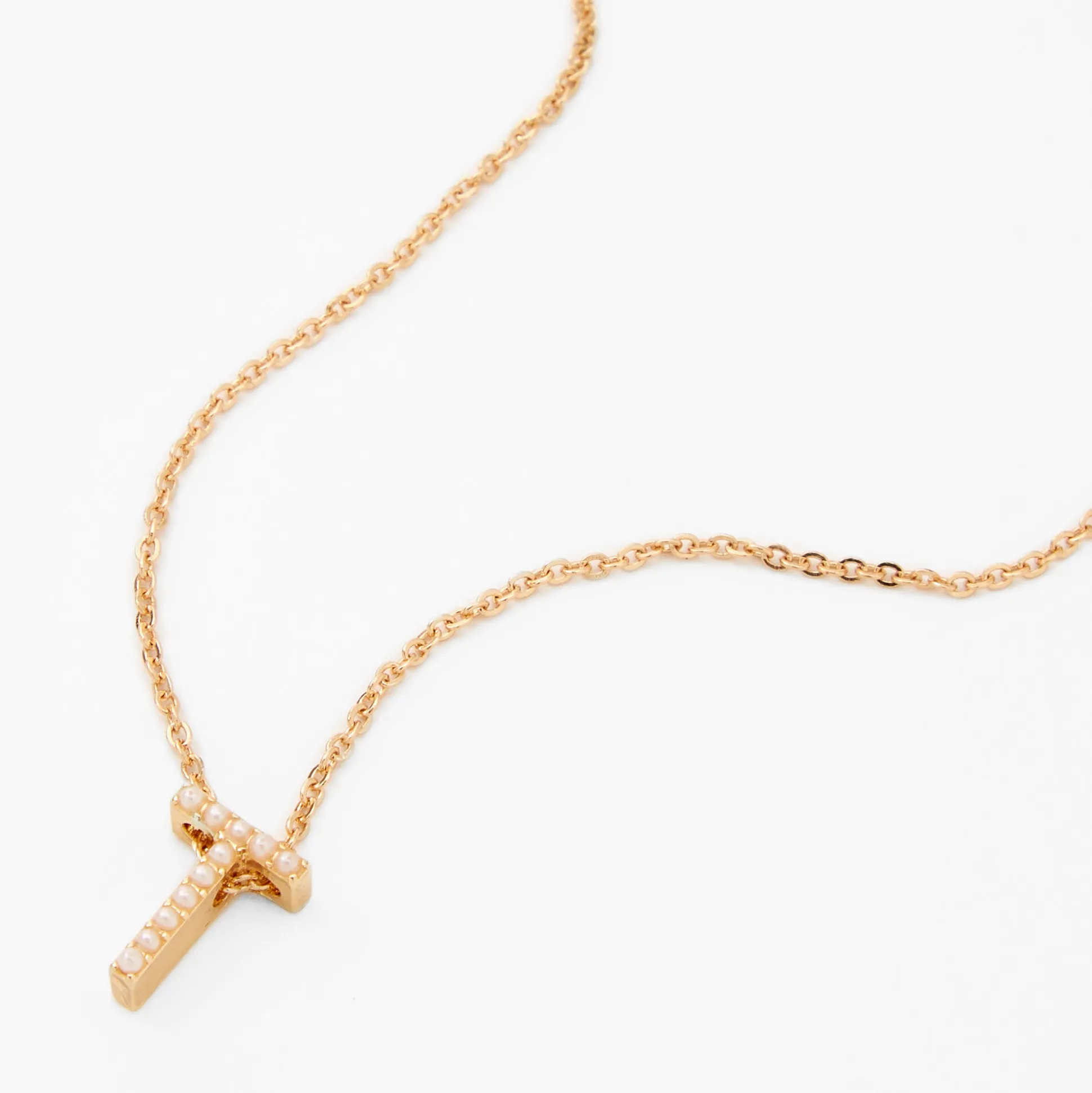 Add a cute and dainty initial pendant necklace to your jewelry collection! This gold-tone chain features a “T” initial charm with mini faux pearl accents.
