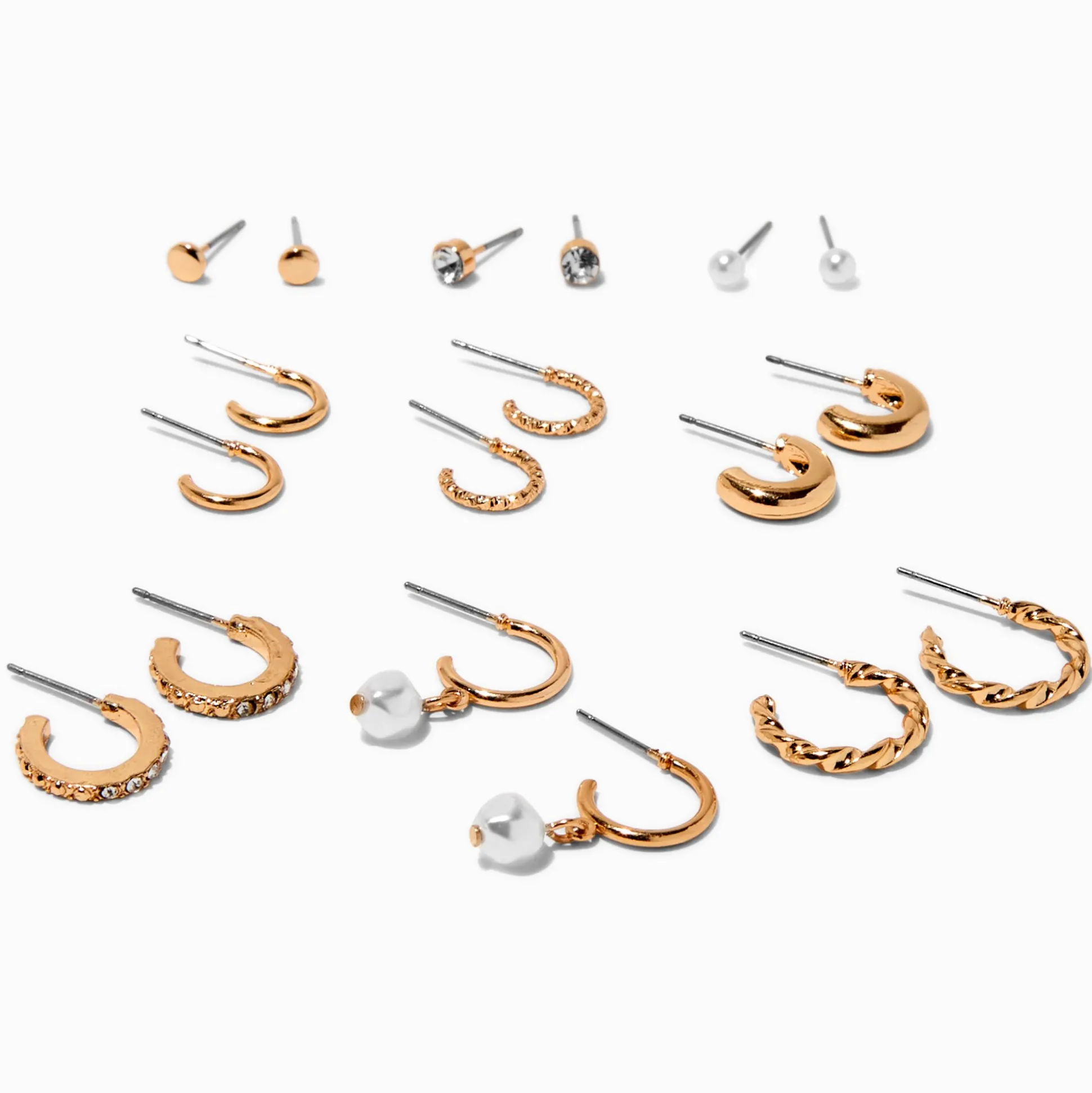 Complete any outfit with a pair of earrings from this set. The set includes 6 pairs of mini hoop earrings and 3 pairs of elegant stud earrings.