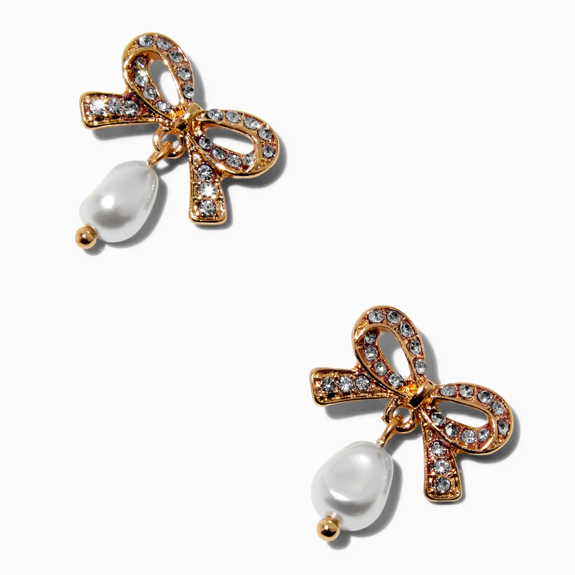Put a bow on it with these easy drop earrings. The gold-tone earrings have a bow design that has a faux pearl drop detail.